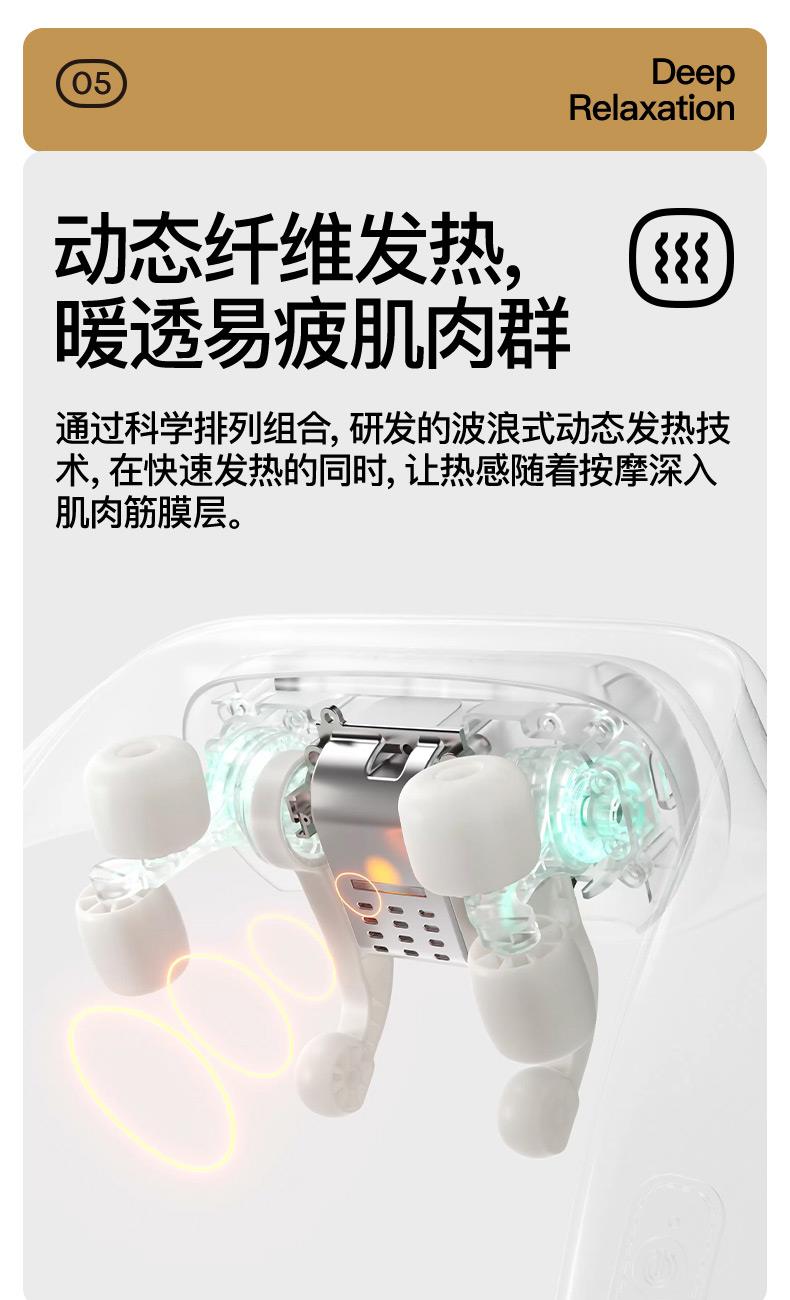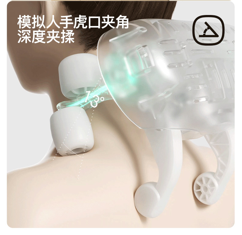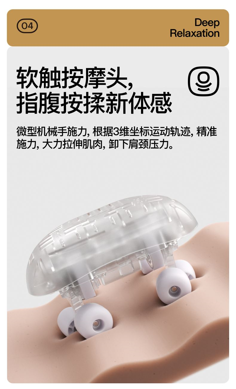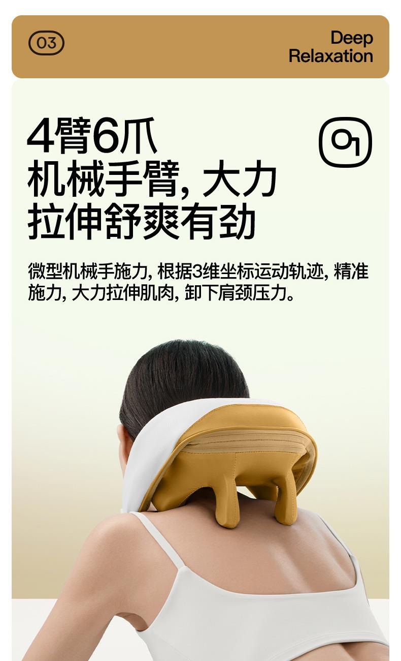 ●仿虎口開(kāi)合抓揉,深度放松酸脹肌肉,通過(guò)精密的轉(zhuǎn)軸和4+2排列的按摩頭,模擬人手虎 口八字開(kāi)合按摩,一抓一揉,還原老師傅按揉 真實(shí)體感。4臂6爪 機(jī)械手臂,大力 拉伸舒爽 有勁 微型機(jī)械手施力,根據(jù)3維坐標(biāo)運(yùn)動(dòng)軌跡,大力拉伸肌肉,卸下肩頸壓力。