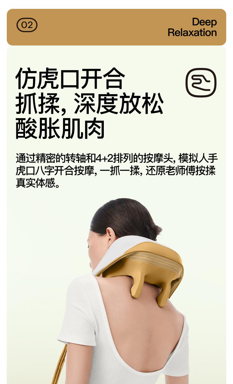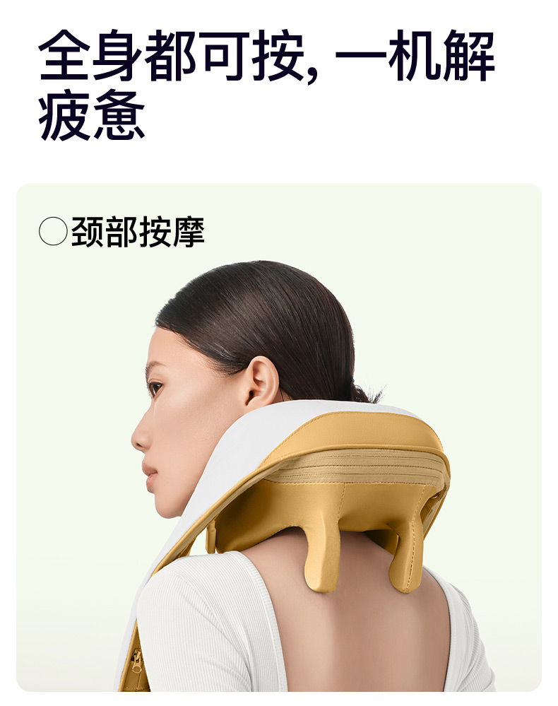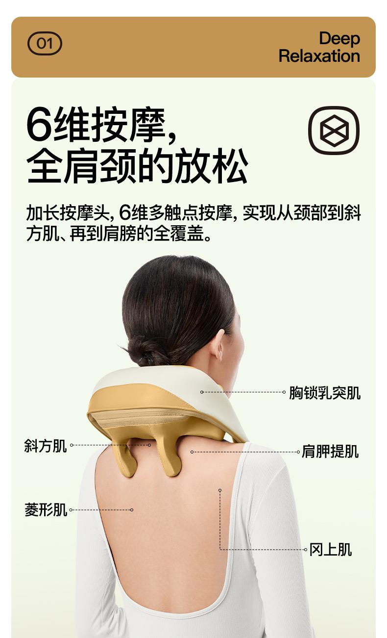 ●6維按摩,全肩頸的放松,加長(zhǎng)按摩頭,6維多觸點(diǎn)按摩,實(shí)現(xiàn)從頸部到斜 方肌、再到肩膀 的全覆蓋。