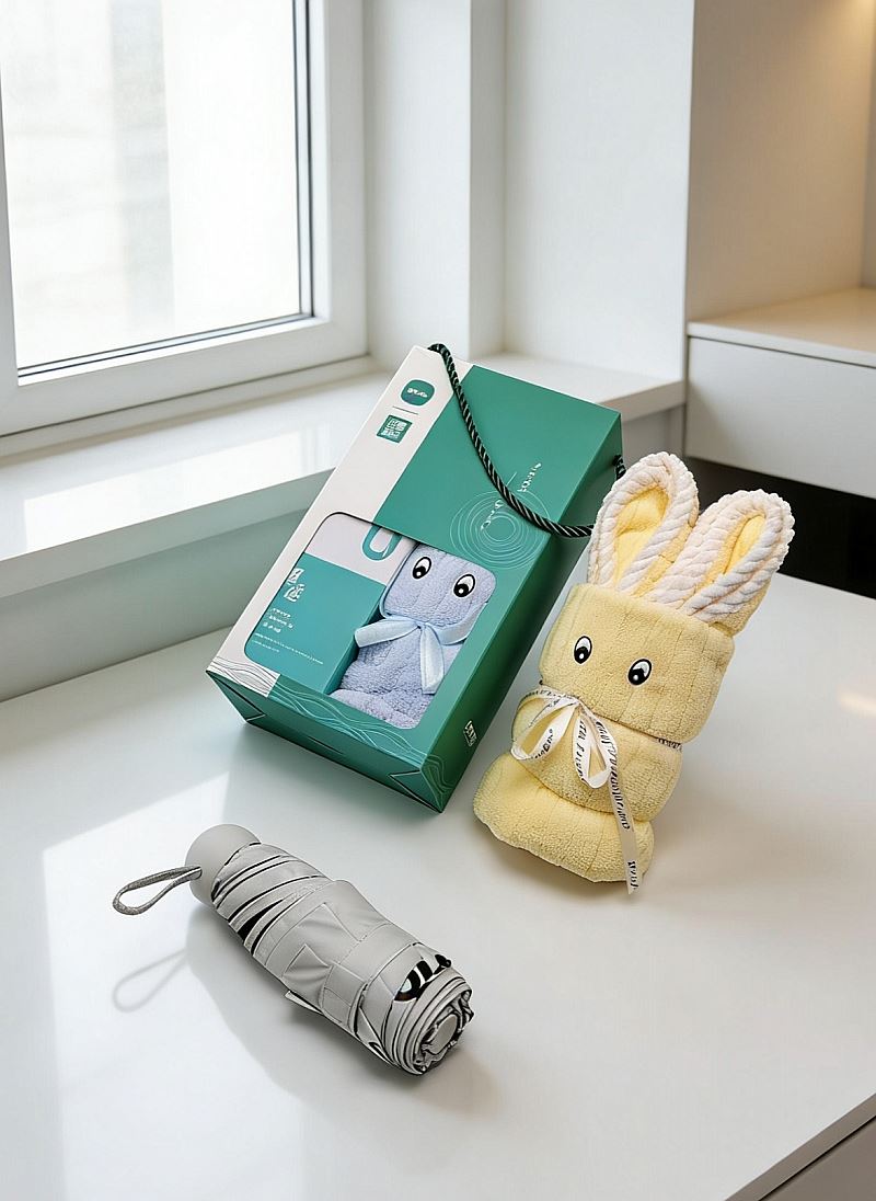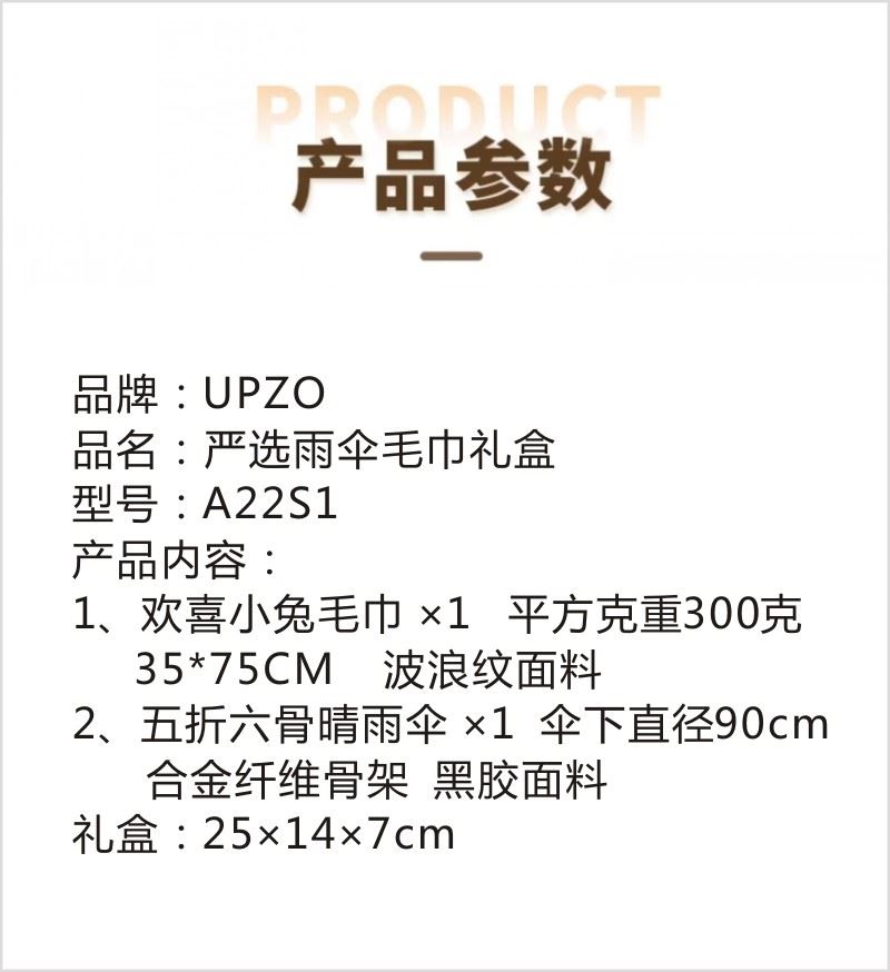 型號:A22S1 產(chǎn)品內(nèi)容: 1、歡喜小兔毛巾×1 35*75CM 平方克重300克 波浪紋面料 精致包邊工藝 2、五折六骨晴雨傘(膠囊傘)×1 傘下直徑90CM 合金纖維骨架 黑膠面料 禮盒規(guī)格:25*14*7CM 歡喜小兔毛巾高平方克重結(jié)合精美包邊與手工折疊小兔造型 五折六骨晴雨傘 膠囊傘尺寸設(shè)計(jì) 黑膠隔熱