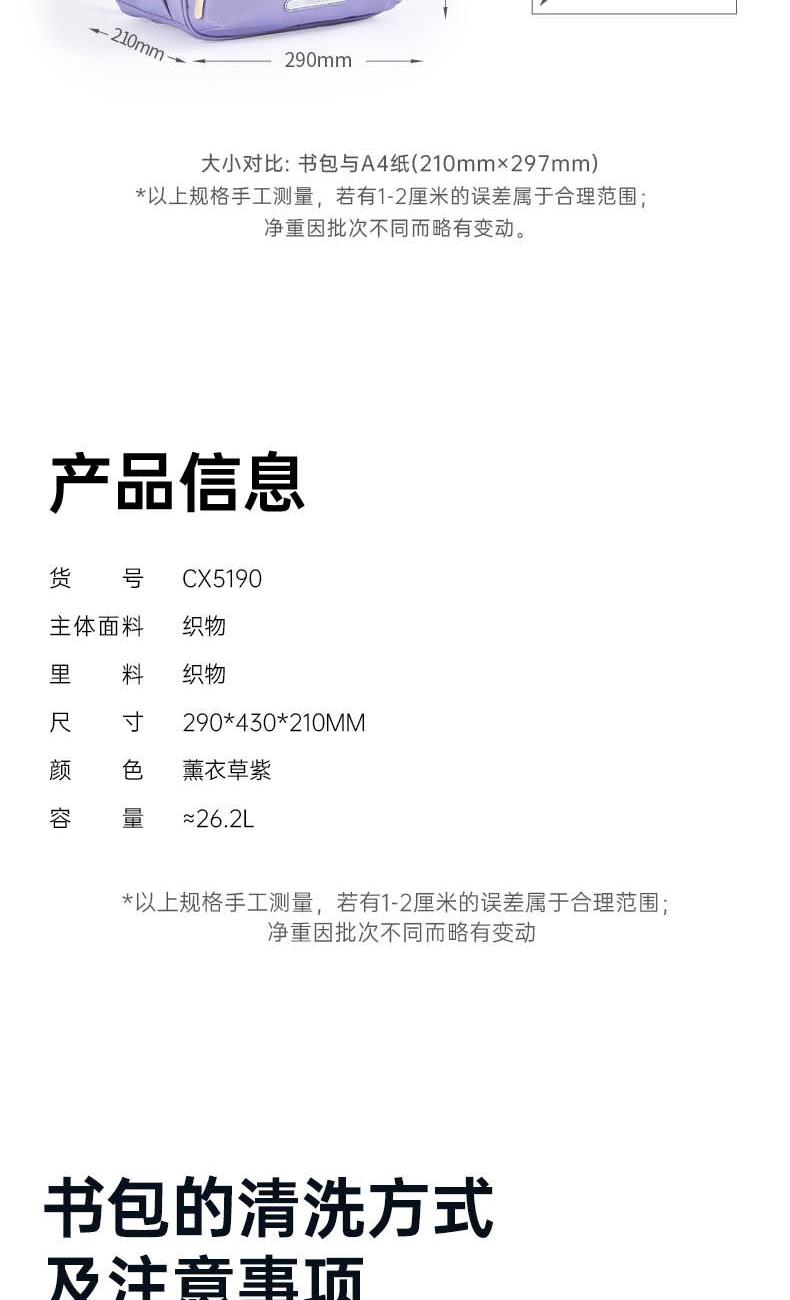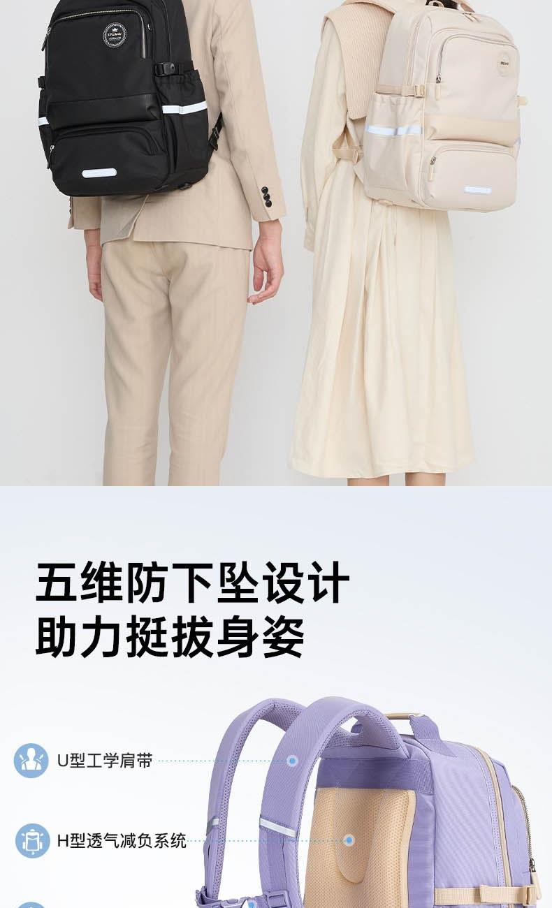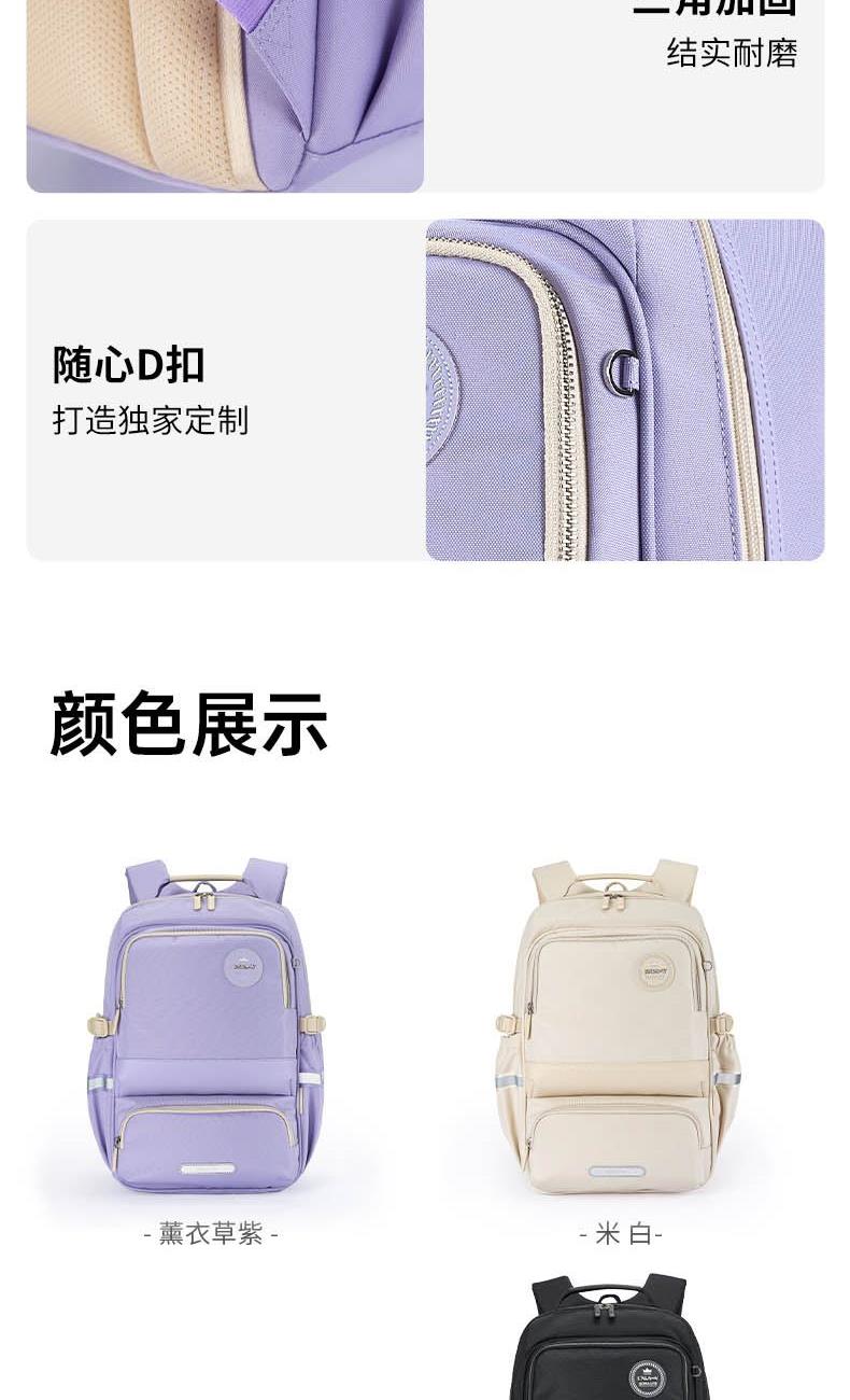 貨號:CX5190 主體面料:織物;里料:織物 顏色:鋼琴黑、米白、薰衣草紫 定位:150-175CM以上/ 初高中生書包 凈重:0.74kg 26.2L