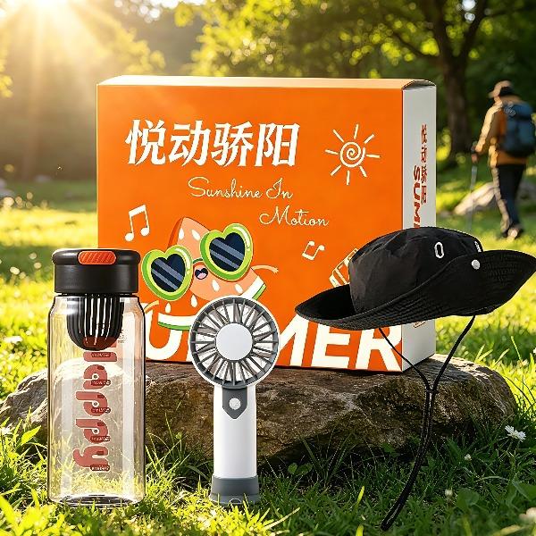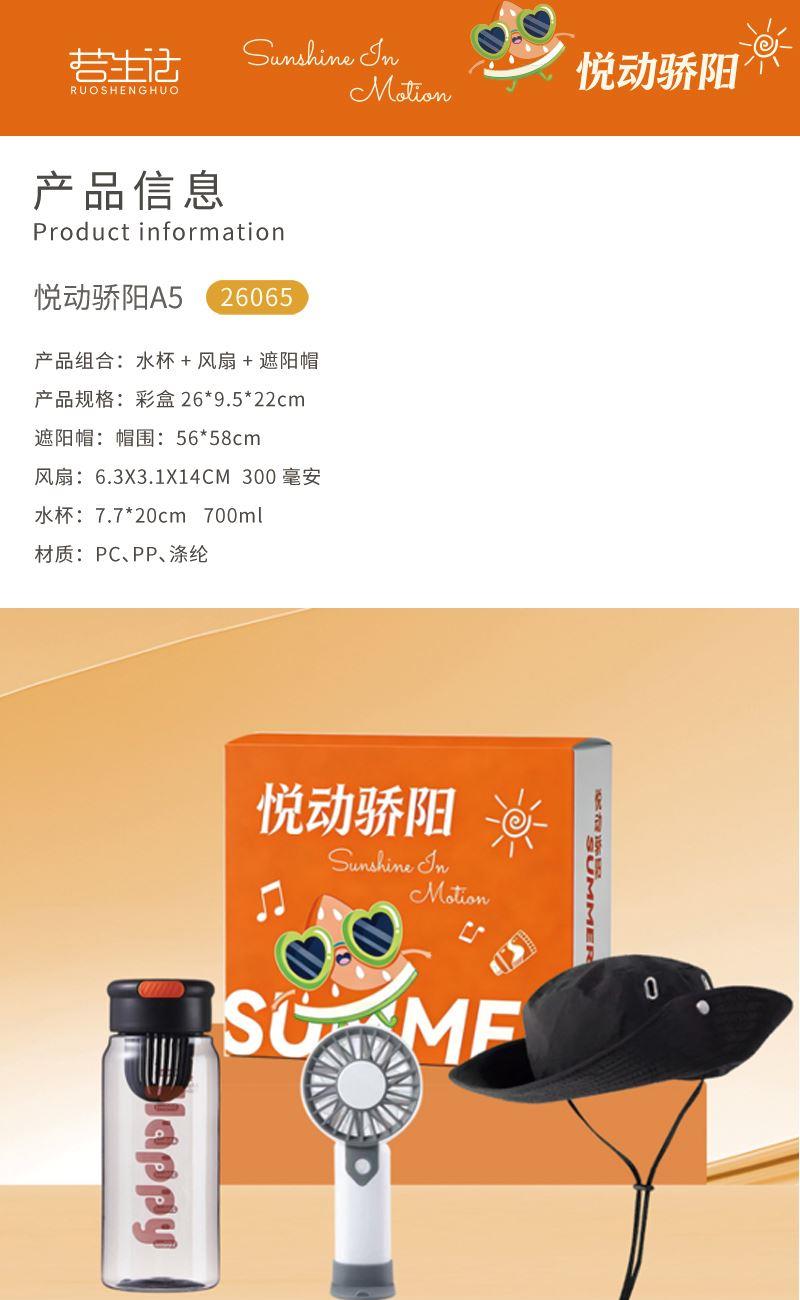 產(chǎn)品組合:水杯+風(fēng)扇+遮陽(yáng)帽 遮陽(yáng)帽:帽圍:56*58cm 風(fēng)扇:6.3X3.1X14CM 300毫安 水杯:7.7*20cm 700ml 材質(zhì):PC、PP、滌綸 包裝:彩盒