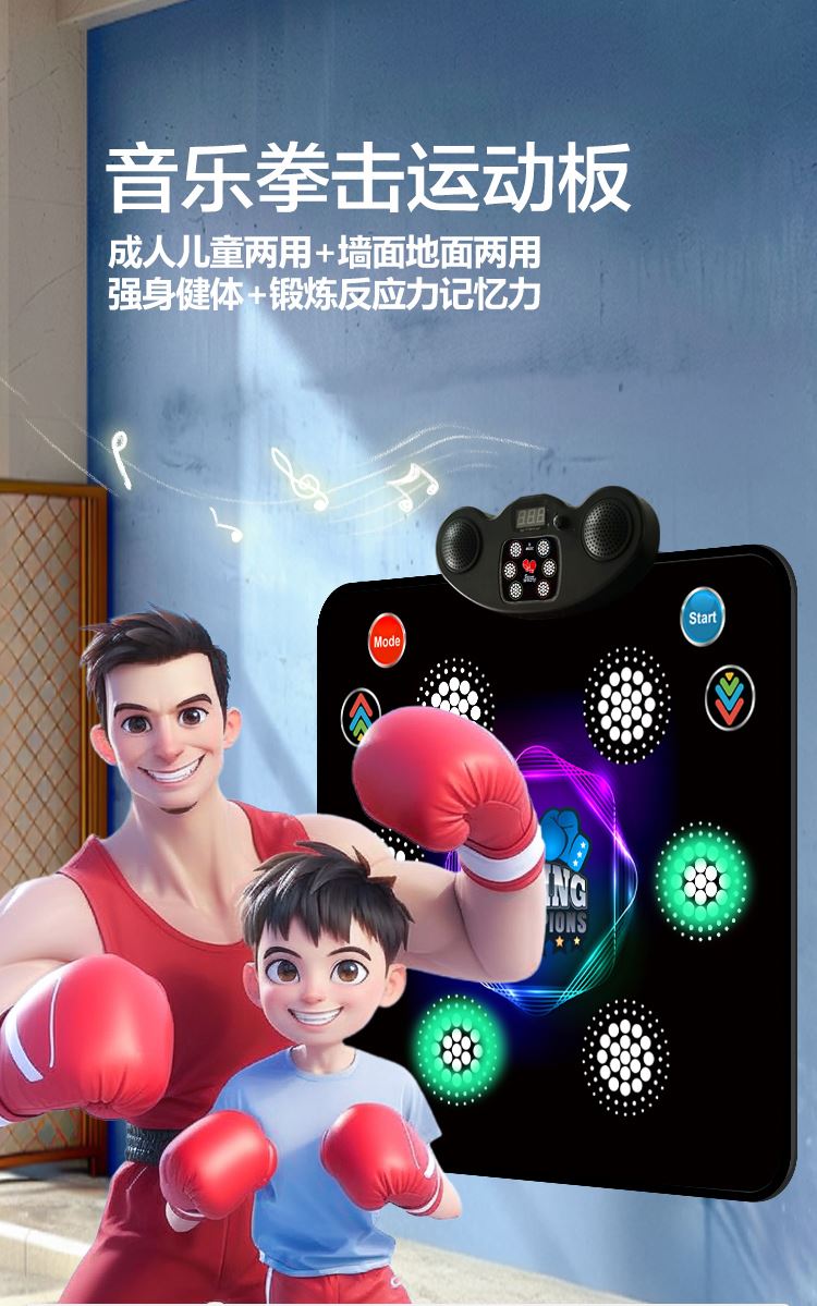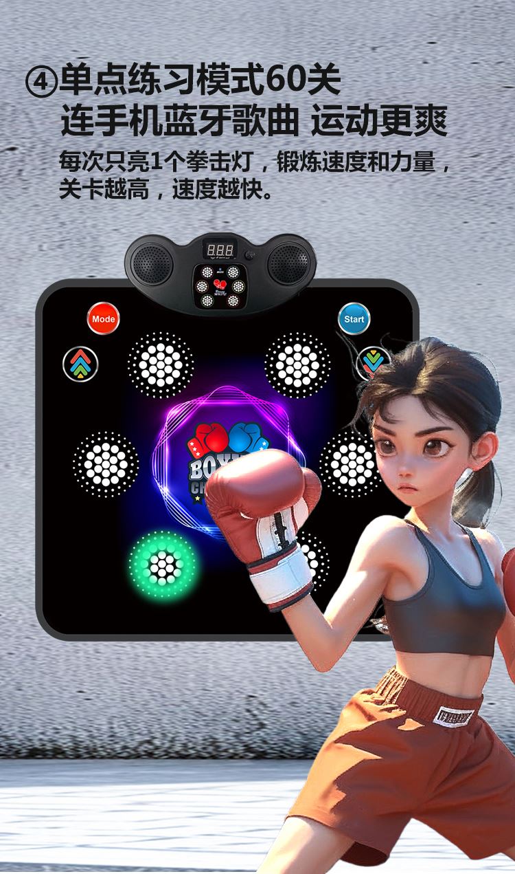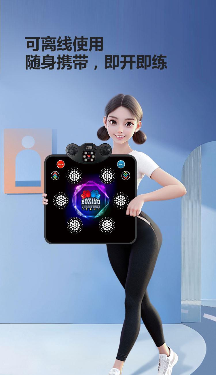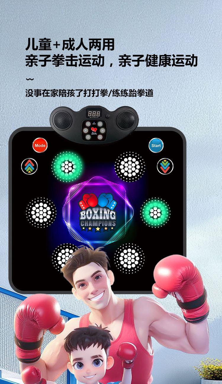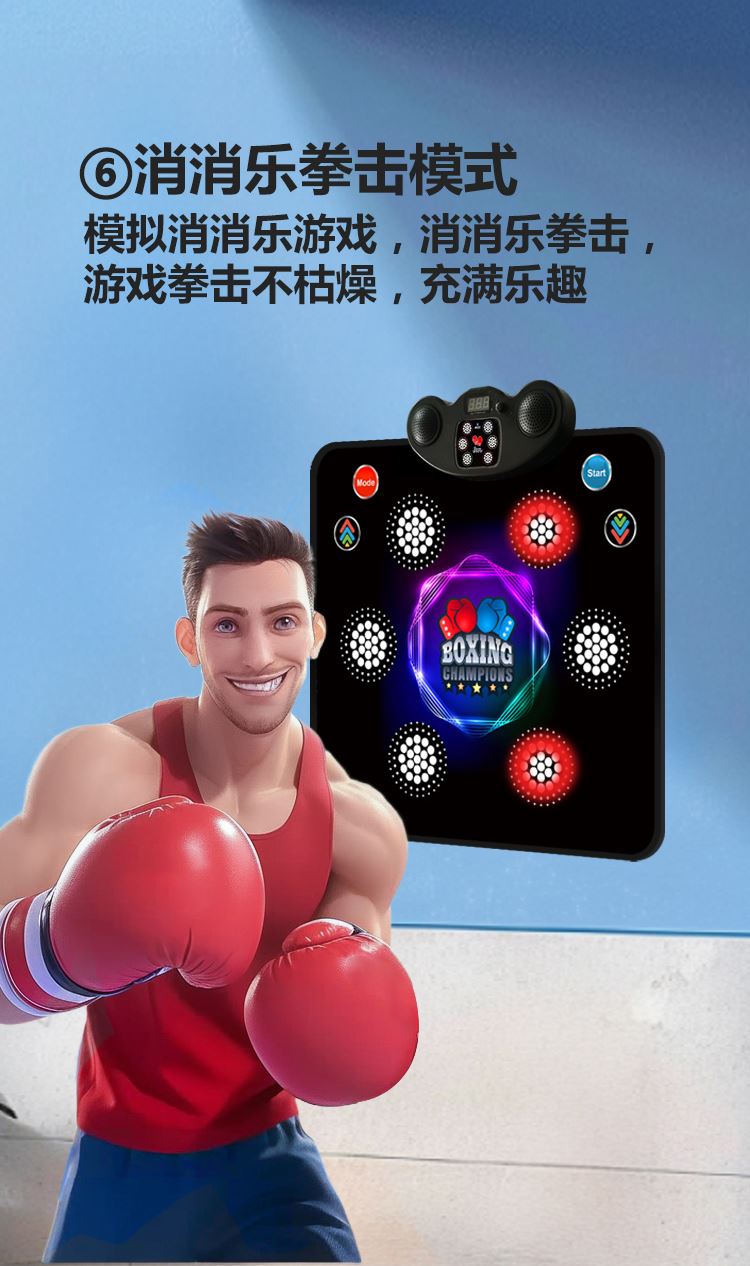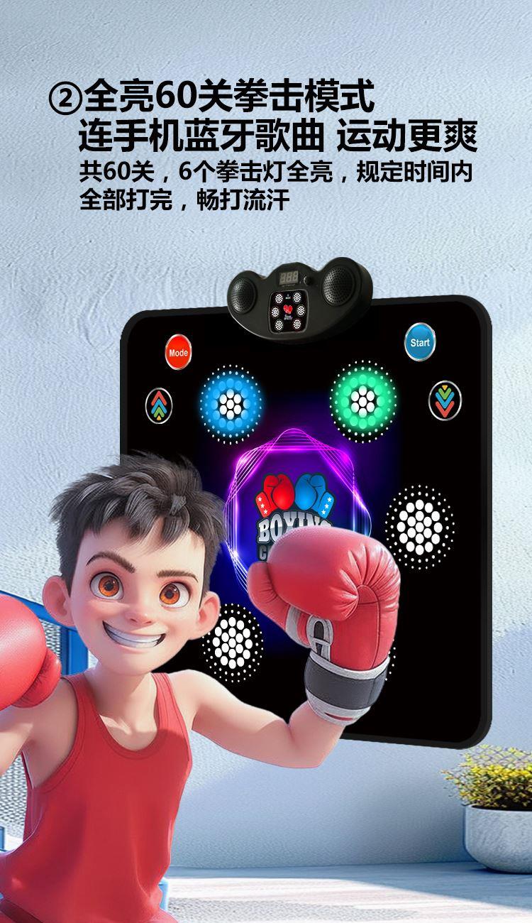 產(chǎn)品:音樂拳擊板 玩法模式:9種模式 尺寸:約57*53*2cm 供電模式:TYPE-C供電、充電寶供電、5號電池供電。 毛重/凈重:1.3/1.2kg 1.成人兒童2用,解壓燃脂健身 2.9種拳擊模式,闖關(guān)挑戰(zhàn)難度變化 3.7種拳擊炫彩燈光變換,趣味強(qiáng) 4.可連接手機(jī)音樂拳擊