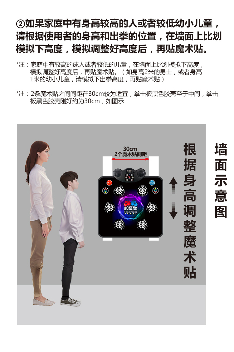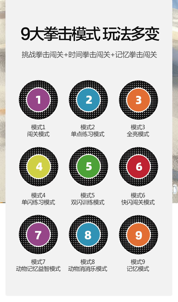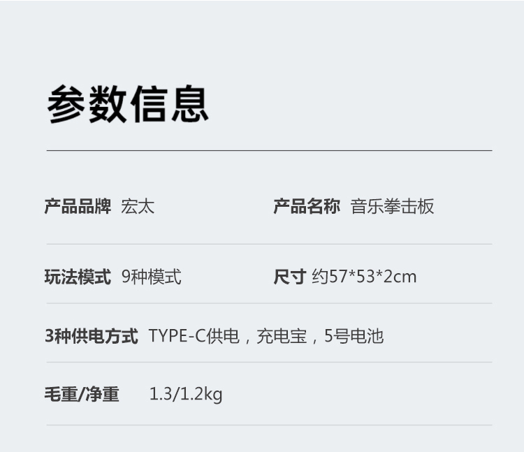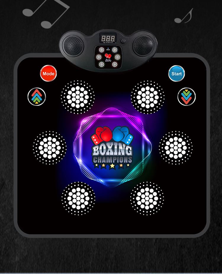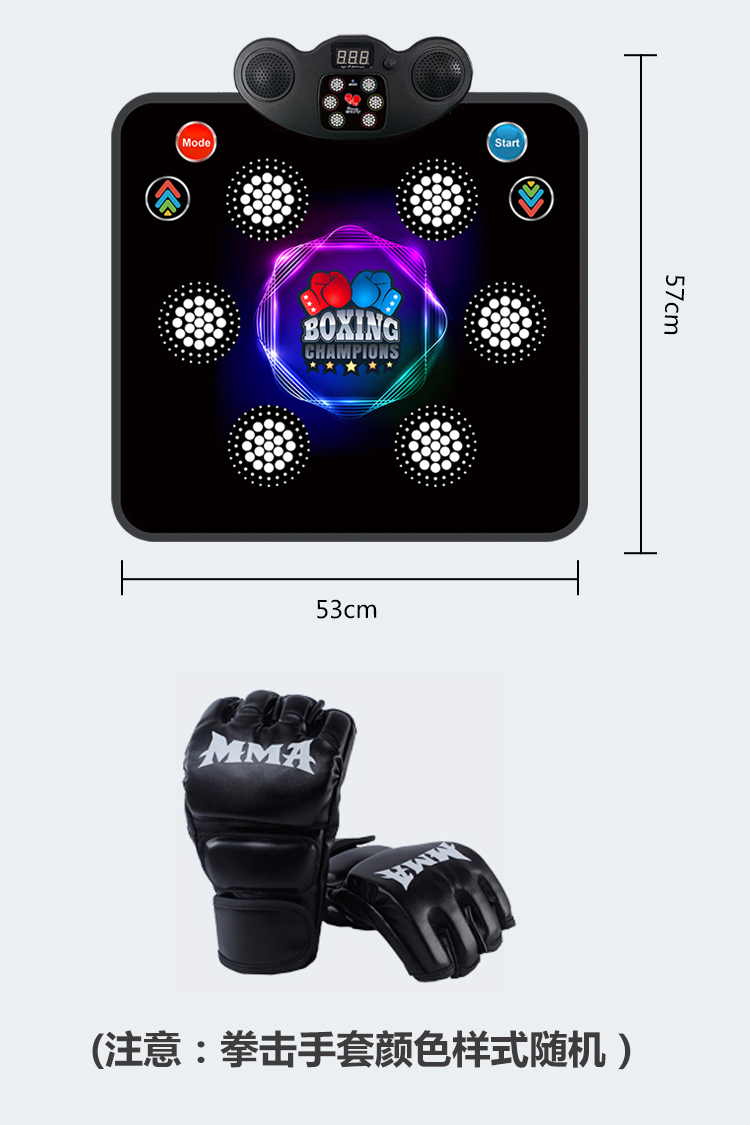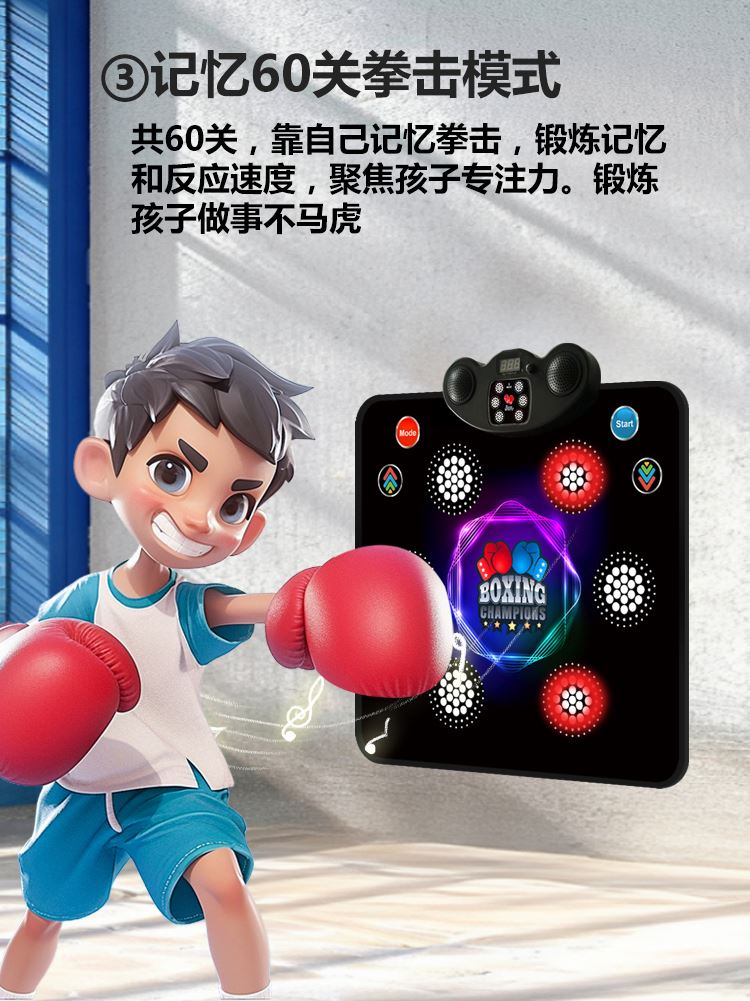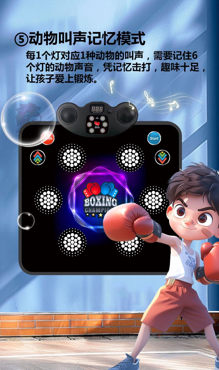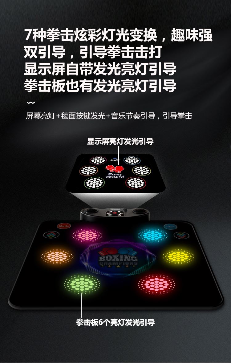 產(chǎn)品:音樂拳擊板 玩法模式:9種模式 尺寸:約57*53*2cm 供電模式:TYPE-C供電、充電寶供電、5號電池供電。 毛重/凈重:1.3/1.2kg 1.成人兒童2用,解壓燃脂健身 2.9種拳擊模式,闖關(guān)挑戰(zhàn)難度變化 3.7種拳擊炫彩燈光變換,趣味強(qiáng) 4.可連接手機(jī)音樂拳擊