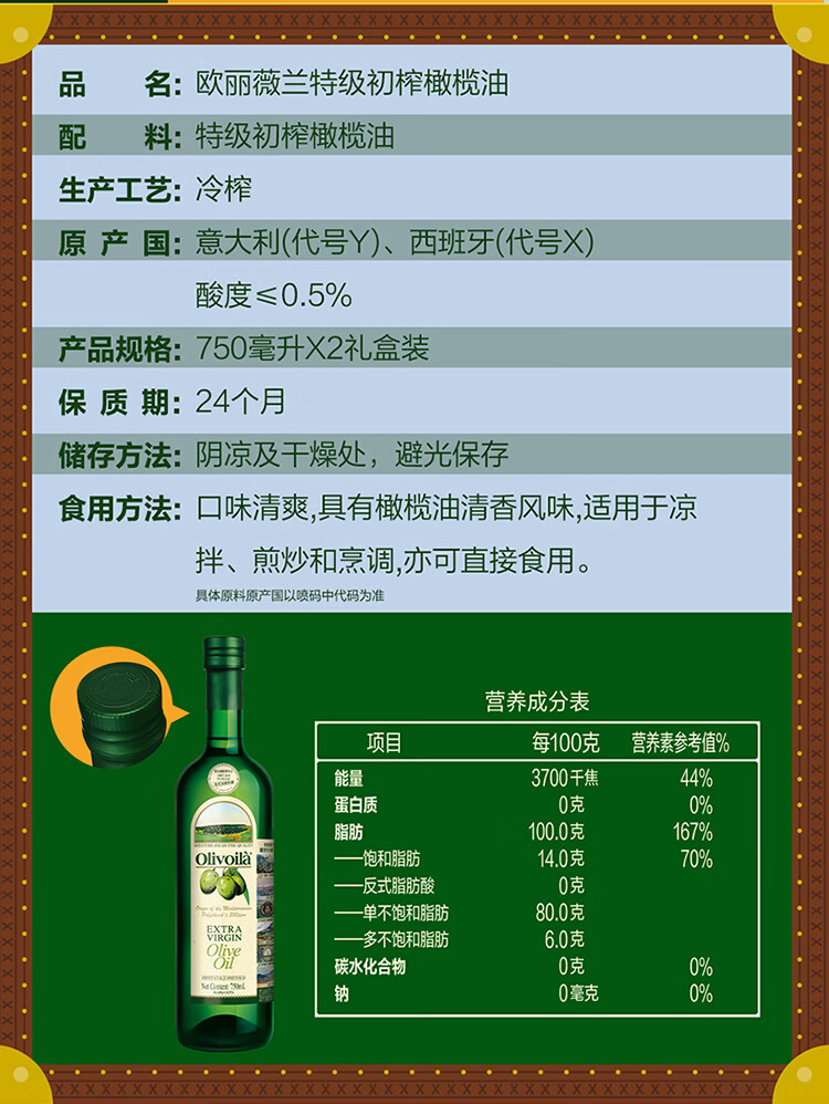 歐麗薇蘭特級初榨橄欖油750ml*2插畫版禮盒 歐麗薇蘭特級初榨橄欖油750ml*2插畫版禮盒
