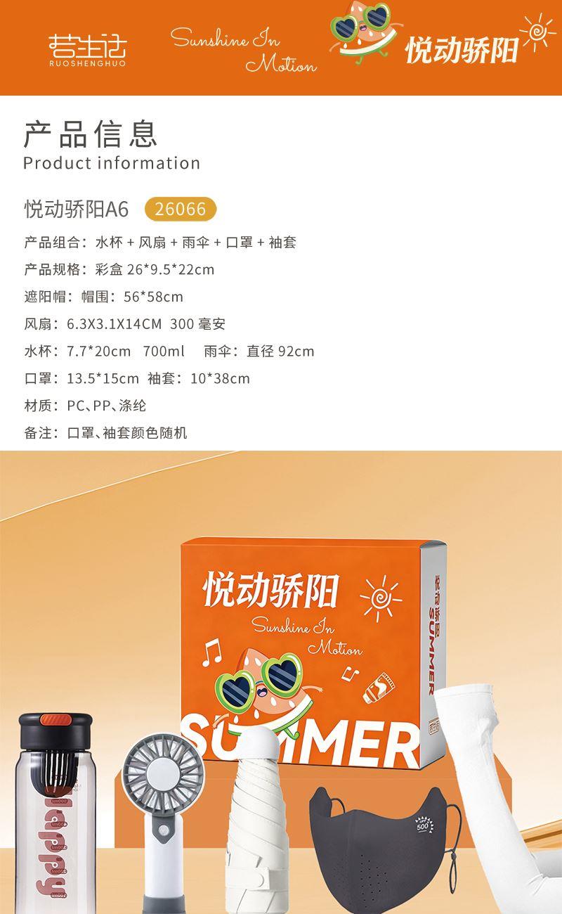 產(chǎn)品組合:水杯+風(fēng)扇+雨傘+口罩+袖套 遮陽帽:帽圍:56*58cm 風(fēng)扇:6.3X3.1X14CM 300毫安 水杯:7.7*20cm 700ml 雨傘:直徑92cm 口罩:13.5*15cm 袖套: 10*38cm 材質(zhì):PC、PP、滌綸 包裝:彩盒