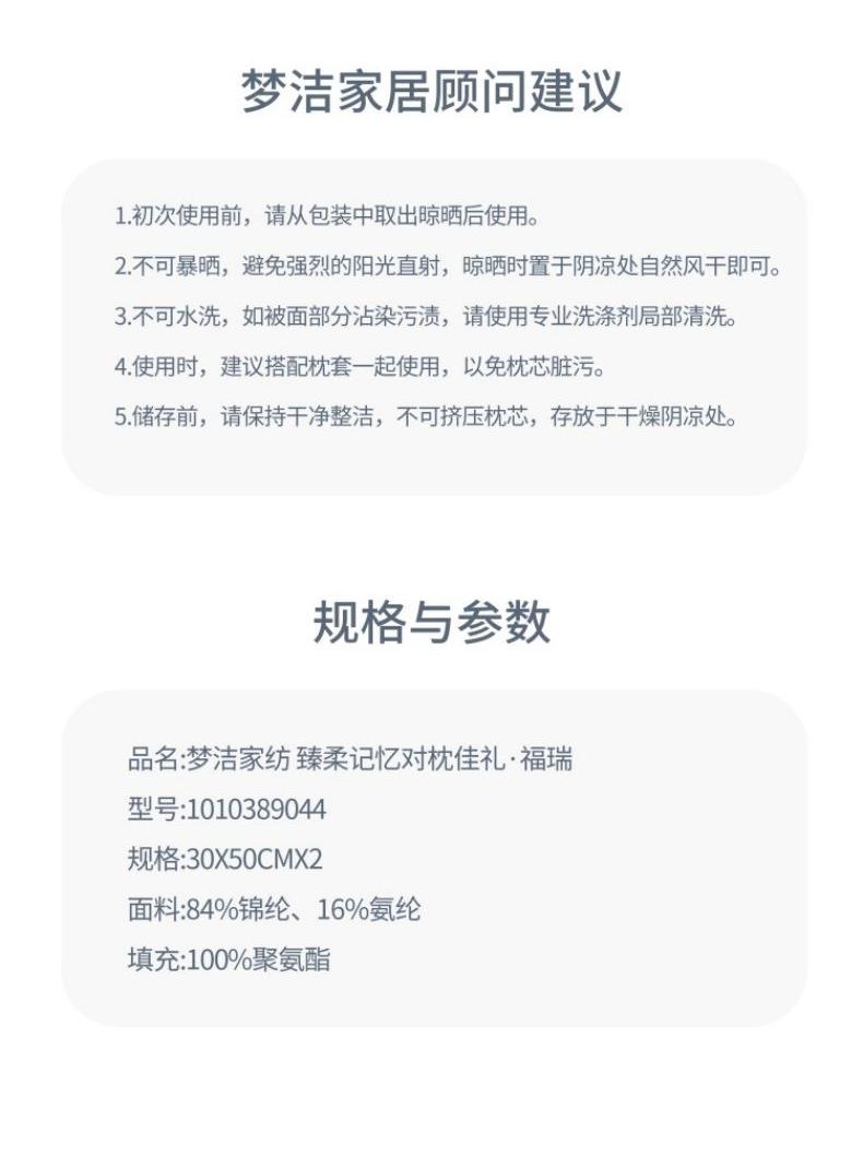 面 料:84%錦綸、16%氨綸 尺 寸:(30×50)cm×2個 填充:聚氨酯 包裝:夢潔團購 紅色三層瓦楞紙盒 30×15×30 「慢回彈科技,一枕即眠」 記憶棉枕芯溫柔包裹頭頸,壓力均勻分散,仿佛被云朵輕輕托住。躺下瞬間,緊繃的肌肉逐漸放松,不知不覺墜入深睡。無論仰睡、側(cè)睡,記憶棉都能智能貼合你的曲線,填補頸部懸空。早晨醒來,肩頸不再僵硬,連翻身次數(shù)都變少。