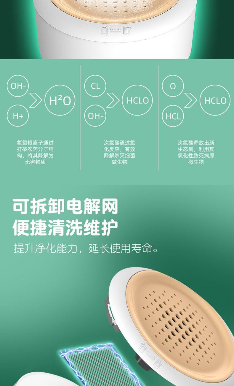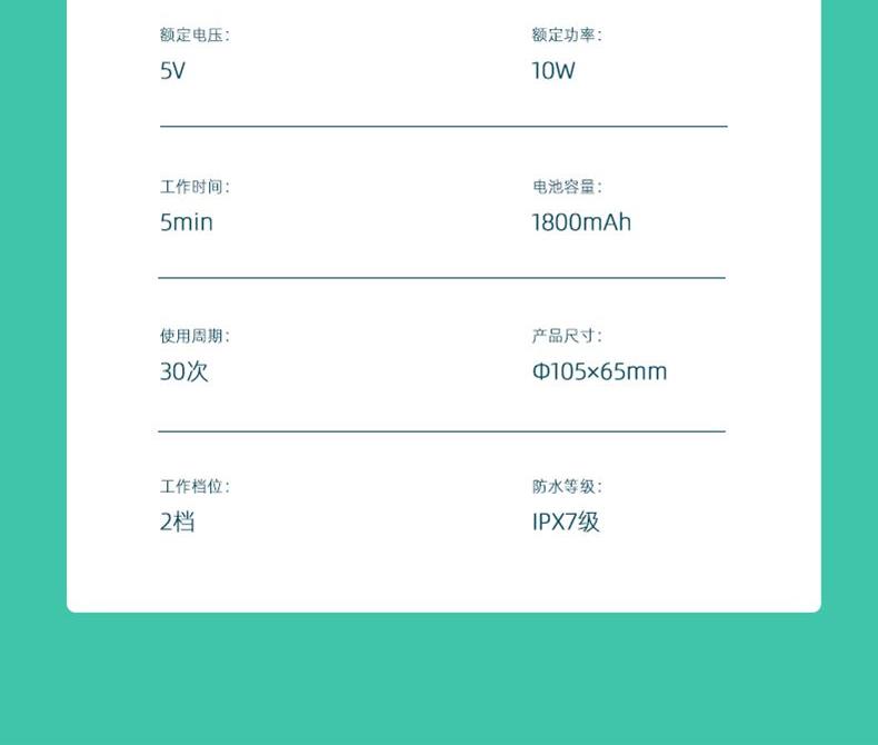 額定功率:10W 電池容量1800mAh 單次工作時間:5min 檔位:2檔 羥基水離子凈化,以水為原料 不挑容器,磁吸款使用便捷 母嬰放心用,嬰孩器具消毒 多重防電保護(hù),低電壓不漏電 一鍵啟動,父母操作無壓力 高效滅,除率99.99%