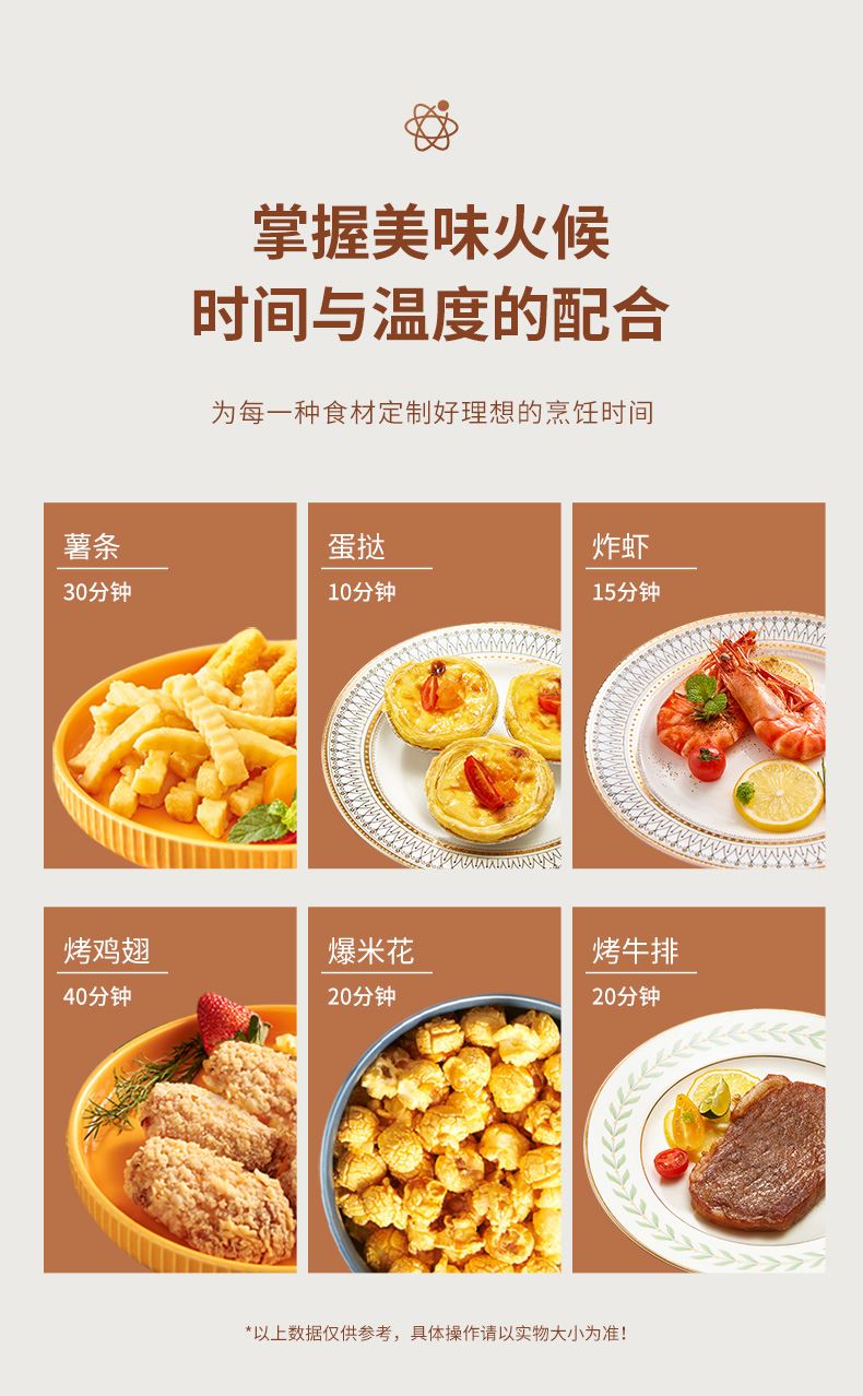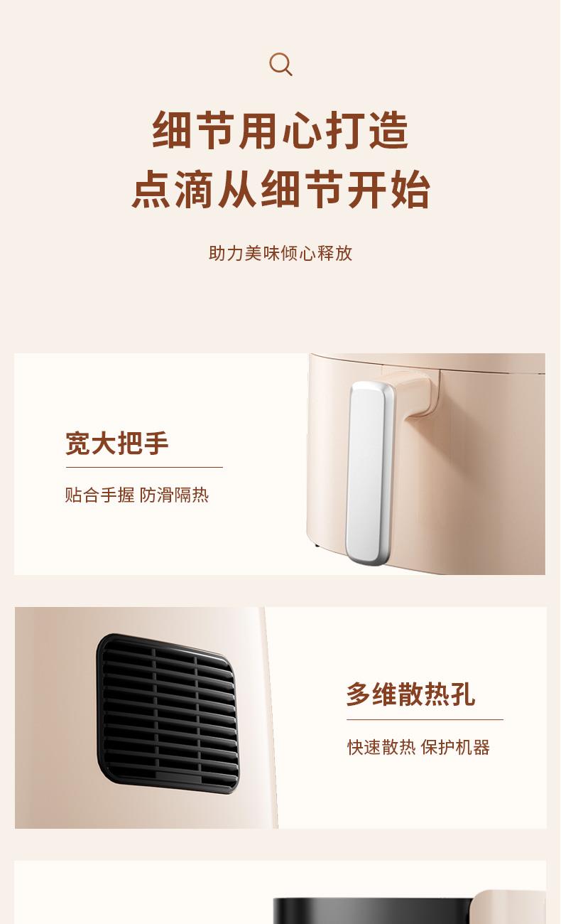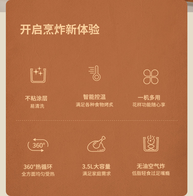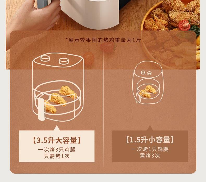 功率:1250W; 容量: 3.5L 淡杏色+電鍍銀:電鍍旋鈕,廚房的新亮點(diǎn) 小占地X大容量:圓萌小巧,黃金容量,收納方便 技術(shù)支持設(shè)計(jì):不銹鋼環(huán)繞發(fā)熱管,3D立體熱風(fēng)循環(huán)技術(shù) 簡(jiǎn)易操作設(shè)計(jì):雙旋鈕調(diào)控,時(shí)間和溫度簡(jiǎn)單操控