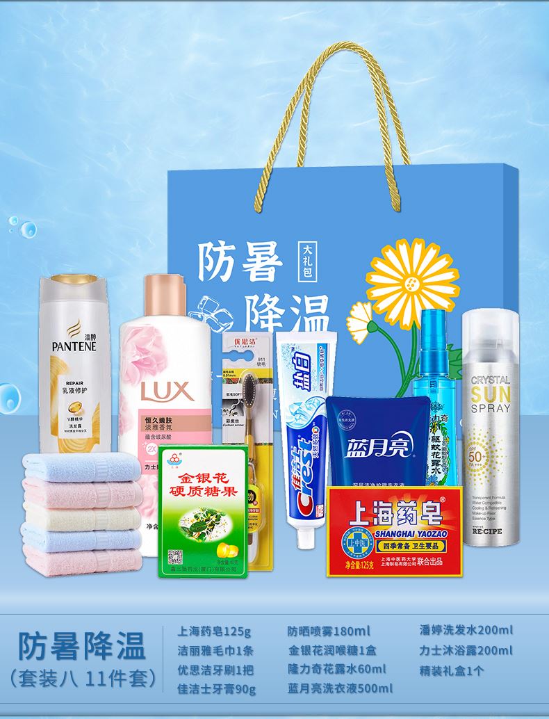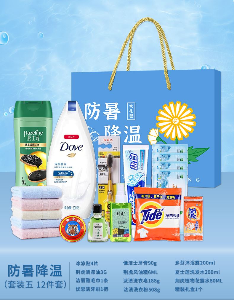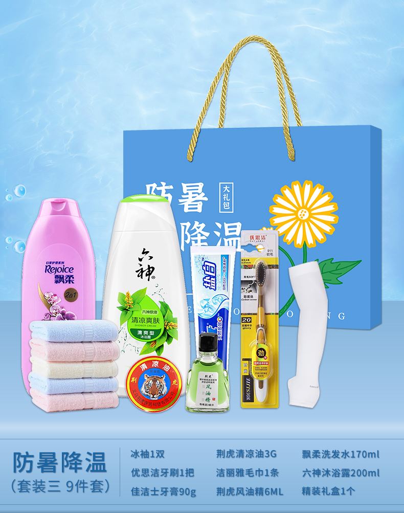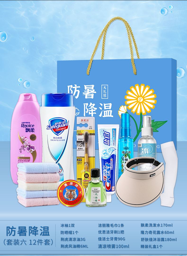 3.首圖款式產(chǎn)品明細(xì):防暑降溫禮盒裝(套裝六 12件套):飄柔洗發(fā)水170ml,潔麗雅毛巾1條,荊虎風(fēng)油精1瓶,清涼噴霧100ml,舒膚佳沐浴露180ml,佳潔士牙膏90g,荊虎清涼油1個(gè),冰袖1雙,隆力奇花露水60ml,優(yōu)思潔牙刷1支,防曬帽1個(gè),精裝禮盒1個(gè)