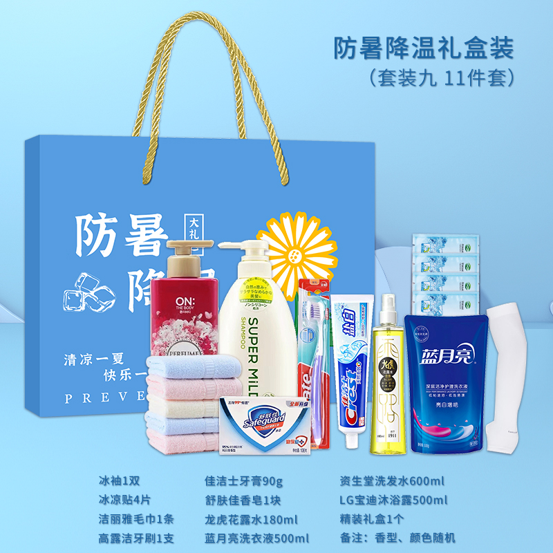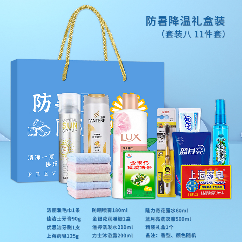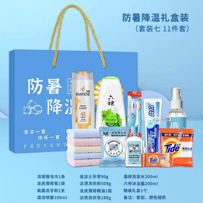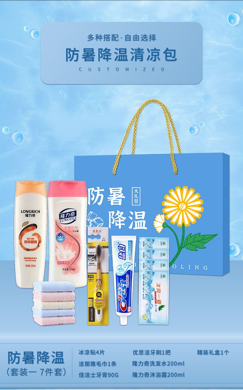 3.首圖款式產(chǎn)品明細(xì):防暑降溫禮盒裝(套裝六 12件套):飄柔洗發(fā)水170ml,潔麗雅毛巾1條,荊虎風(fēng)油精1瓶,清涼噴霧100ml,舒膚佳沐浴露180ml,佳潔士牙膏90g,荊虎清涼油1個(gè),冰袖1雙,隆力奇花露水60ml,優(yōu)思潔牙刷1支,防曬帽1個(gè),精裝禮盒1個(gè)