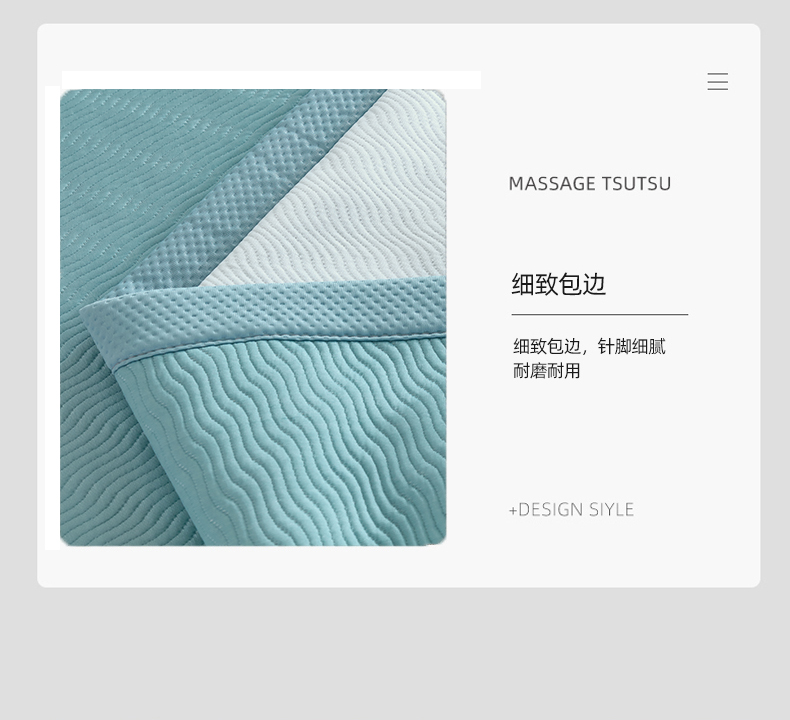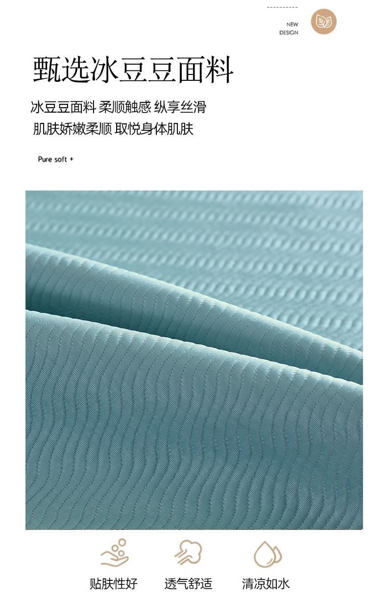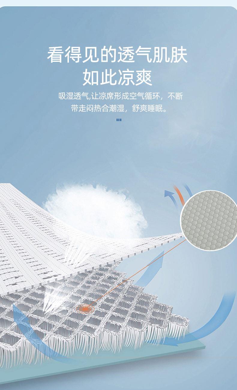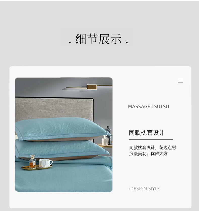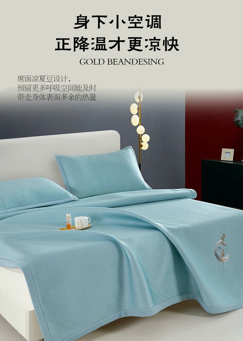 規(guī)格:180*200cm 枕套:48*74cm*2 面料:冰豆豆 復(fù)合料:無紡布 執(zhí)行標(biāo)準(zhǔn):Q/TDY 01-2016 安全類別:GB18401-2010 B類 1.嚴(yán)選豆豆按摩顆粒,微微凸起,QQ彈,讓身體和席面預(yù)留更多,自由呼吸的空間 并且軟到措手不及。 2.黑科技涼感絲降溫纖維、清涼透氣,體感降溫,杜絕出汗,無懼機(jī)洗,高密織,水洗不易變形。