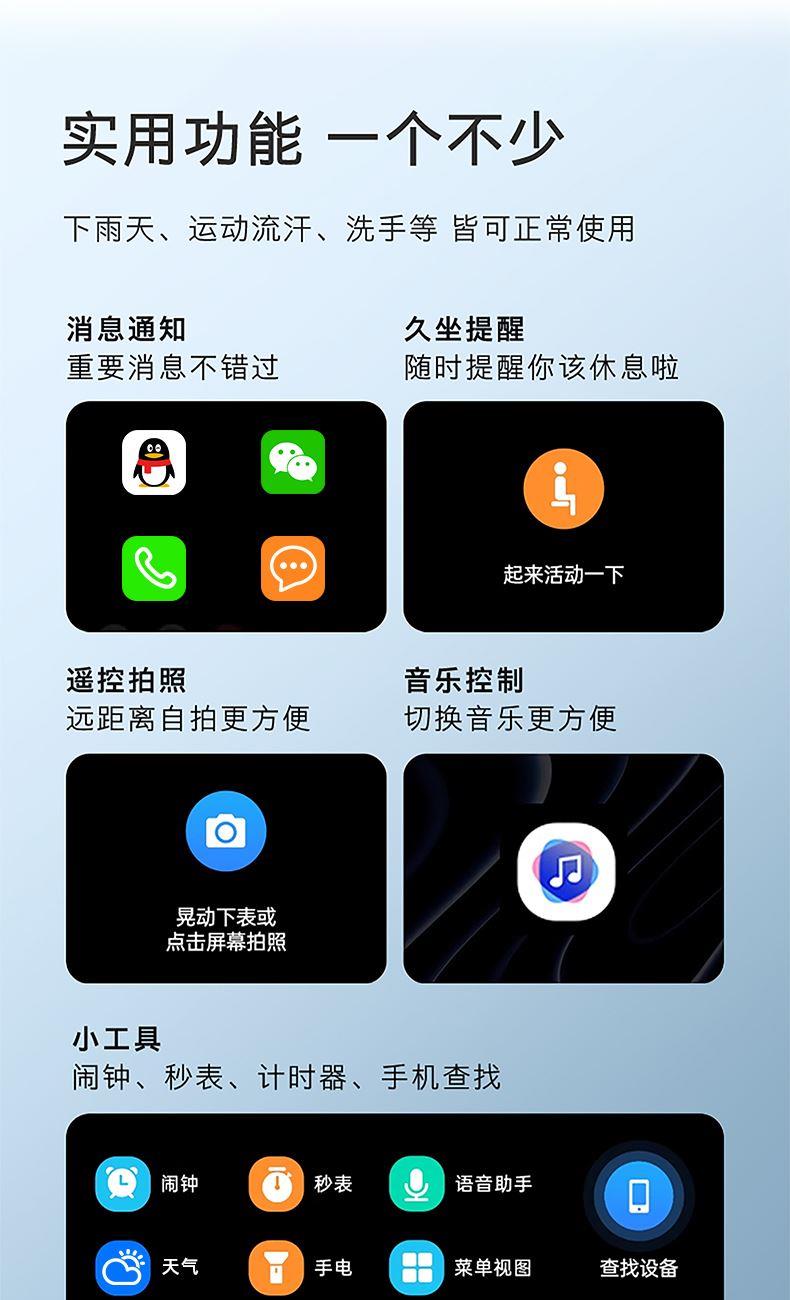 1.46英寸TFT高清屏,360*360分辨率、電池220mAh、支付寶離線支付、自定義表盤(pán)、智能分屏顯示、NFC(門禁)、遙控拍照、排水動(dòng)能、收款碼、鬧鐘、藍(lán)牙通話、來(lái)電提醒、消息提醒、通話記錄、藍(lán)牙音樂(lè)、久坐提醒、心率、血壓、血氧、睡眠檢測(cè)、運(yùn)動(dòng)記步、卡路里、多種運(yùn)動(dòng)模式、菜單風(fēng)格切換、計(jì)算器、查找手機(jī)、秒表、語(yǔ)音助手、呼吸訓(xùn)練、天氣預(yù)報(bào)、勿擾模式