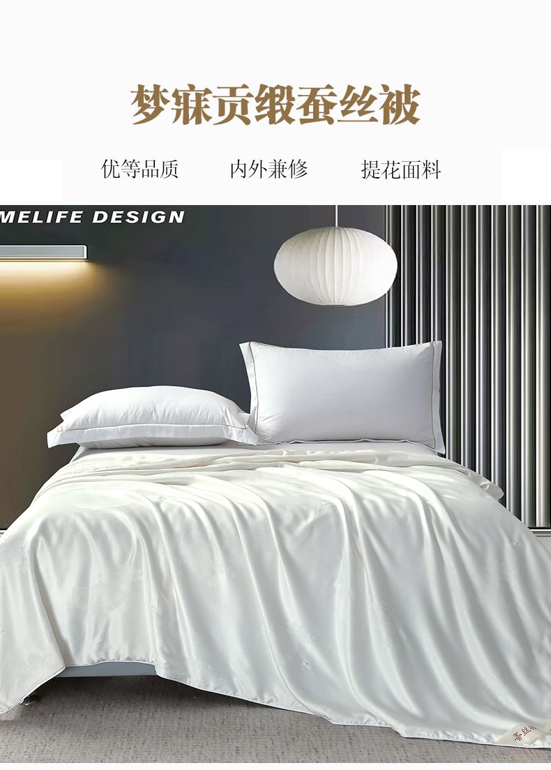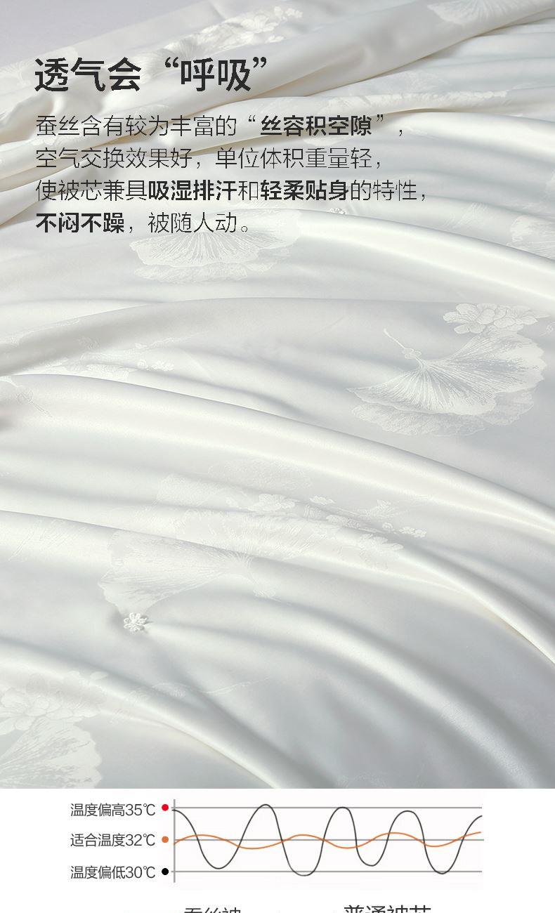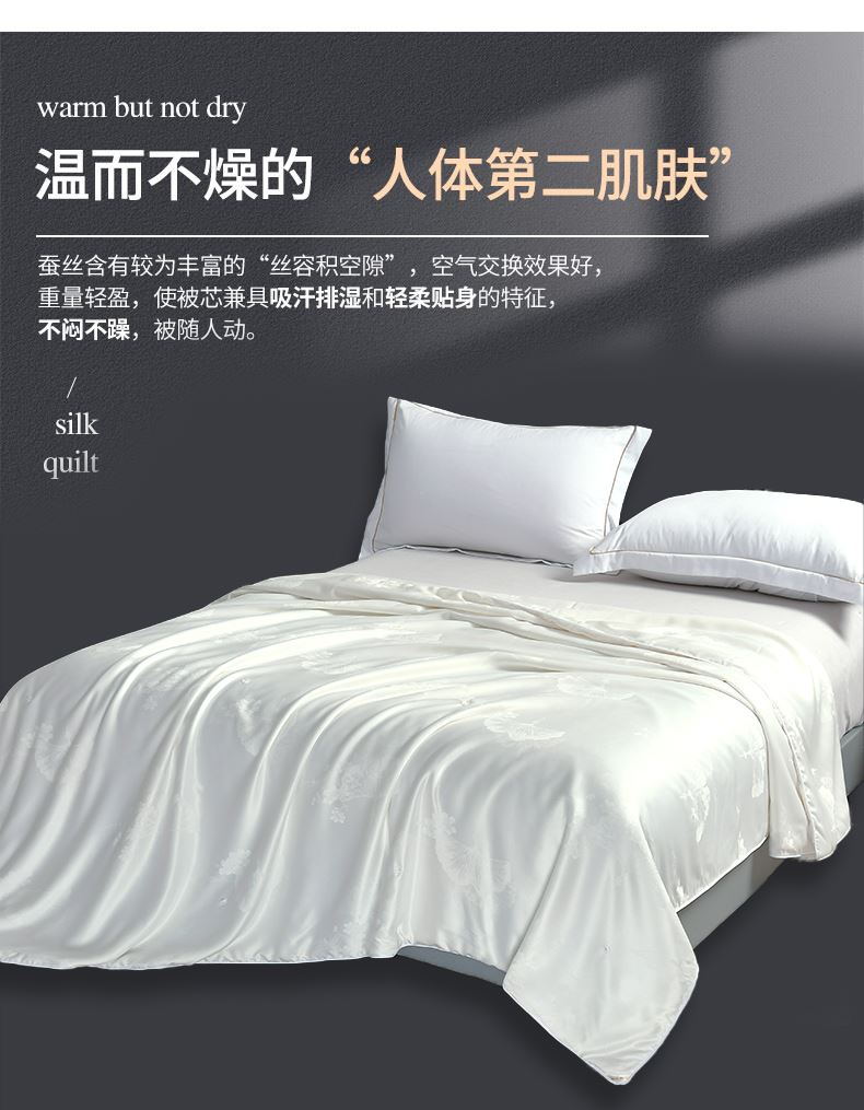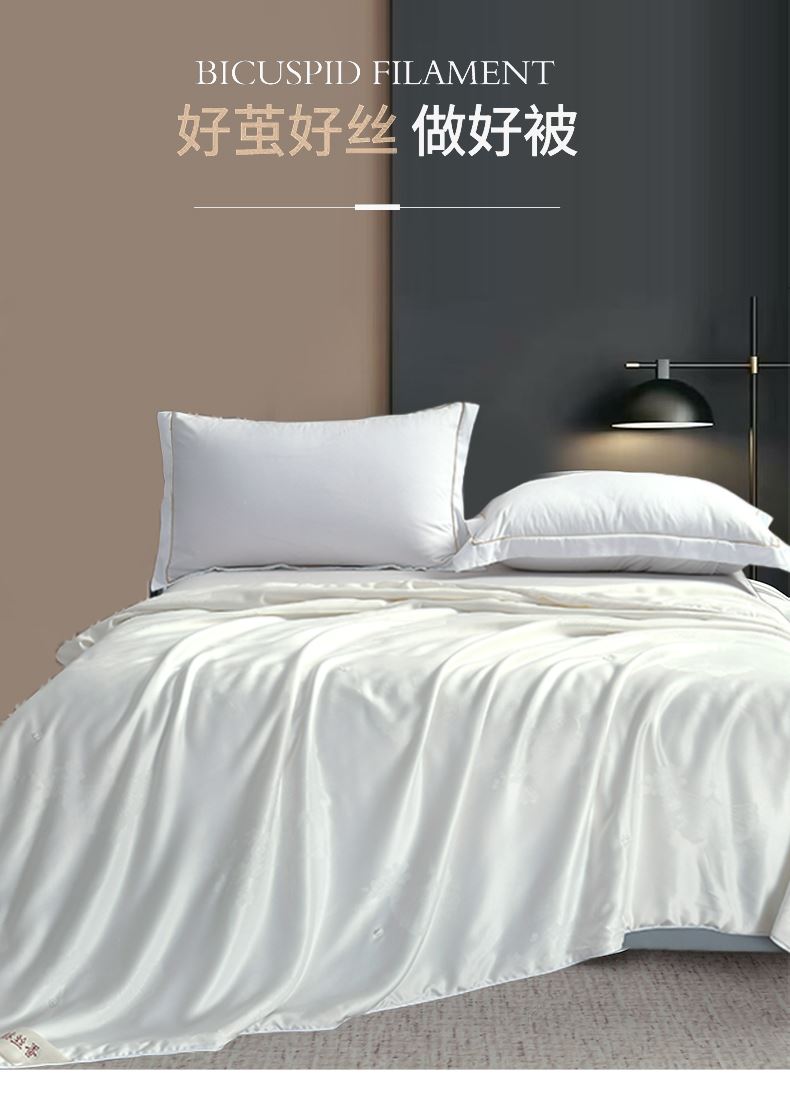 規(guī)格:200*230cm 面料:貢緞提花 填充:蠶絲(中長(zhǎng)絲) 克重:1500g 執(zhí)行標(biāo)準(zhǔn):GB/T22796-2021 安全類別:GB18401-2010 B類 1.貢緞提花面料具有出色的透氣吸濕性,輕薄會(huì)呼吸,助你安然入睡 2.從樹中提取的木漿原液,采用溶劑紡絲技術(shù),成品于天絲面料,柔滑、垂感好、輕薄、飄逸、柔滑涼爽、垂感好,夏季使用更清涼。