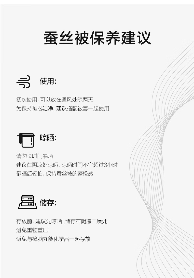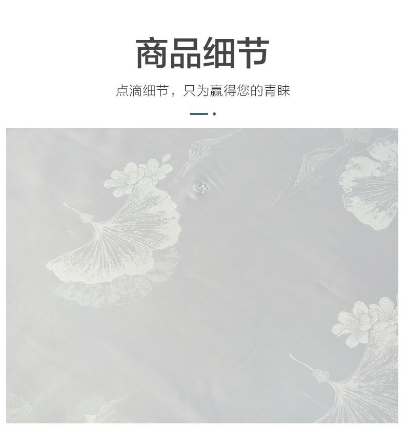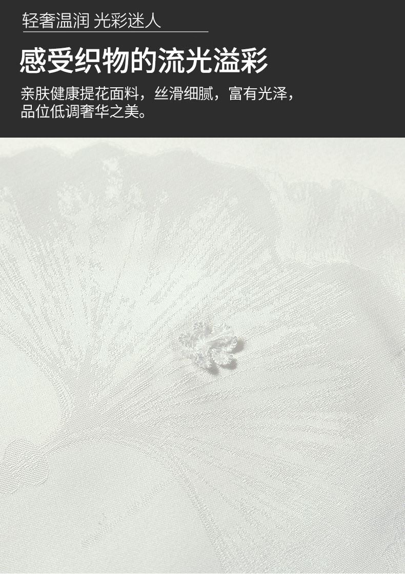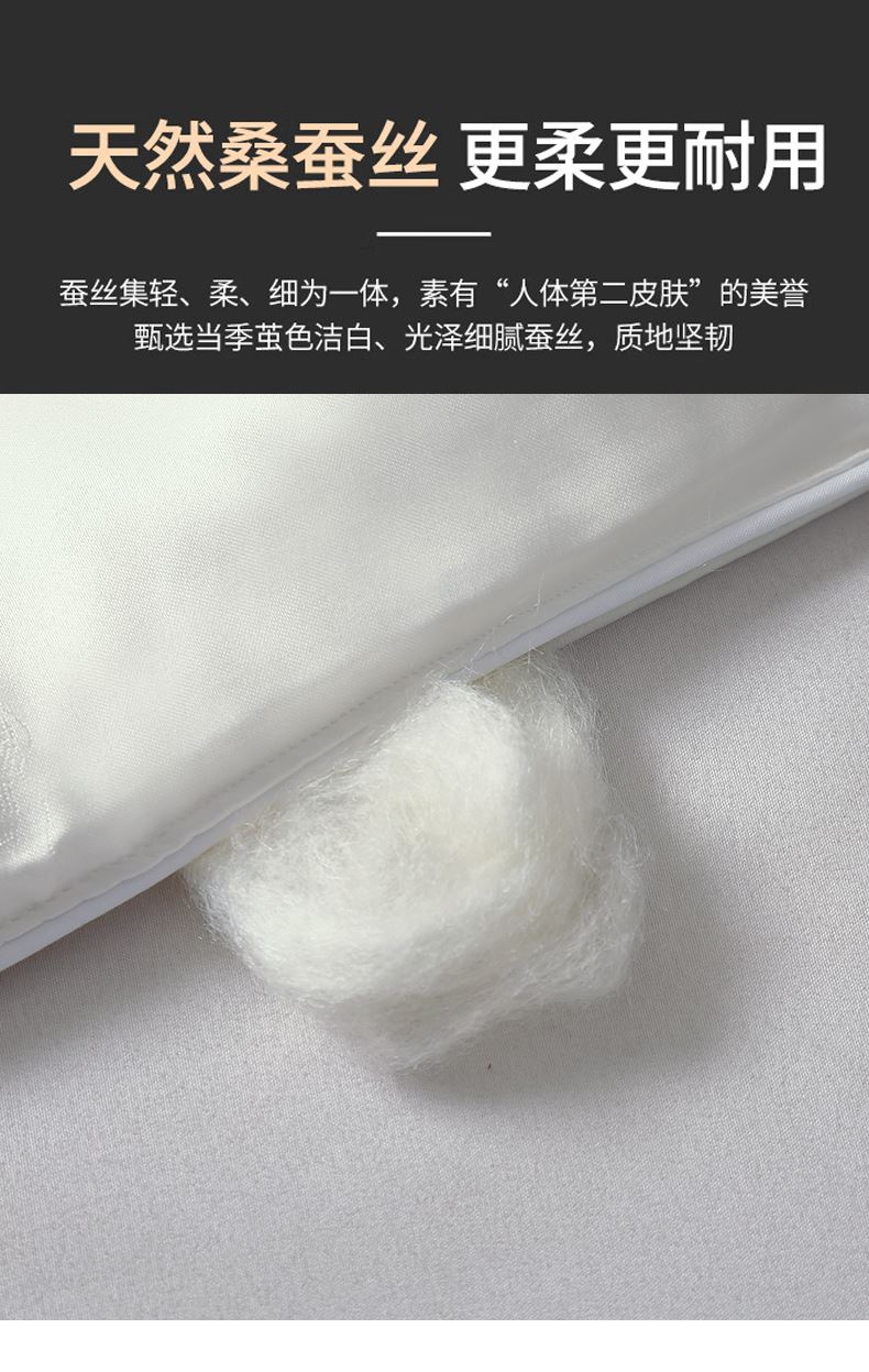 規(guī)格:200*230cm 面料:貢緞提花 填充:蠶絲(中長(zhǎng)絲) 克重:1500g 執(zhí)行標(biāo)準(zhǔn):GB/T22796-2021 安全類別:GB18401-2010 B類 1.貢緞提花面料具有出色的透氣吸濕性,輕薄會(huì)呼吸,助你安然入睡 2.從樹中提取的木漿原液,采用溶劑紡絲技術(shù),成品于天絲面料,柔滑、垂感好、輕薄、飄逸、柔滑涼爽、垂感好,夏季使用更清涼。