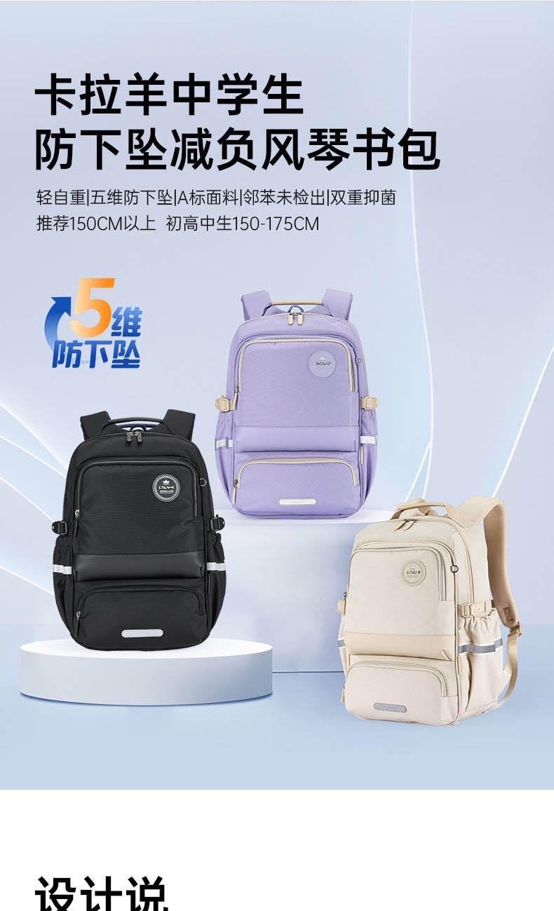 貨號(hào):CX5190 主體面料:織物;里料:織物 顏色:鋼琴黑、米白、薰衣草紫 定位:150-175CM以上/ 初高中生書包 凈重:0.74kg 26.2L