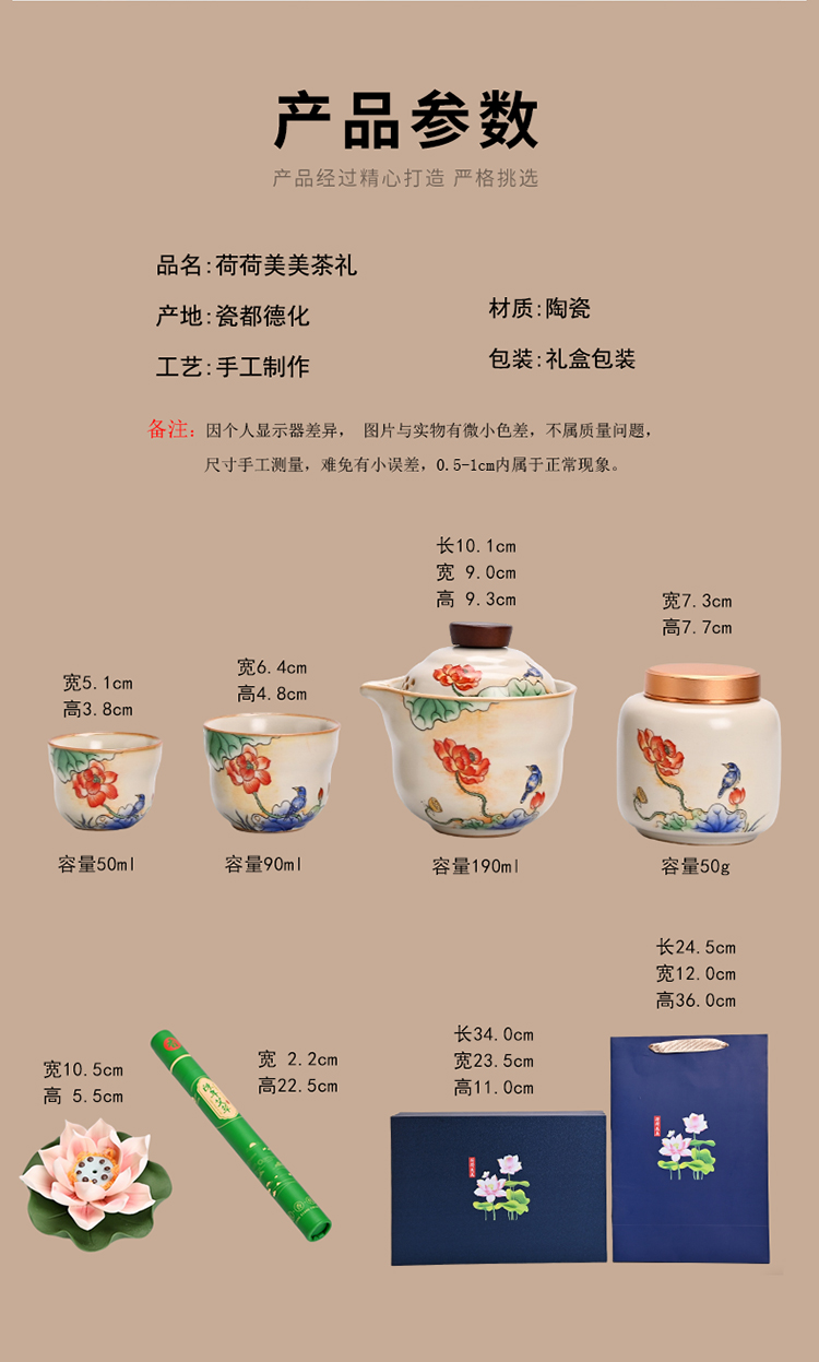 壺:10*9厘米190ml 品茗杯:6.4*4.8厘米90ml 茶葉罐:8**7厘米 禮盒:34*24*11厘米 精選高嶺土等優(yōu)質(zhì)原料,經(jīng)高溫?zé)贫?,質(zhì)地致密,氣孔率小,吸水率低,不易吸附異味,清洗便捷.手工捏花,造型美麗,寓意美好,搭配禮盒包裝,自用贈禮兩宜。