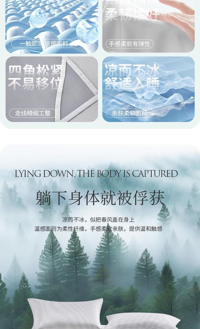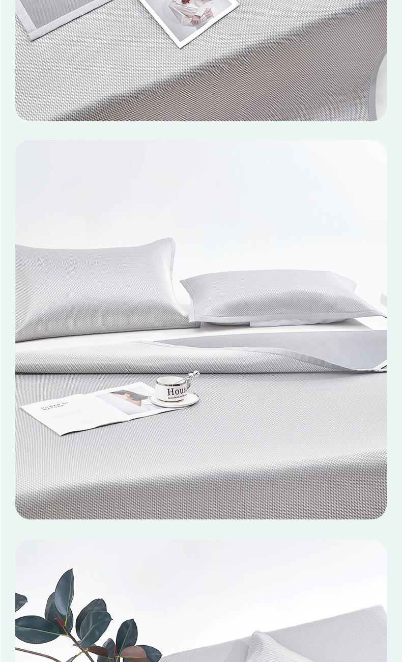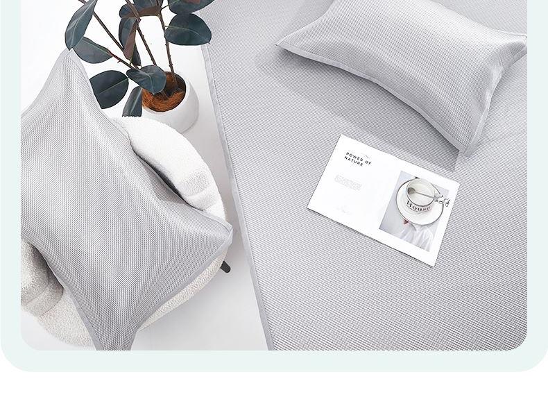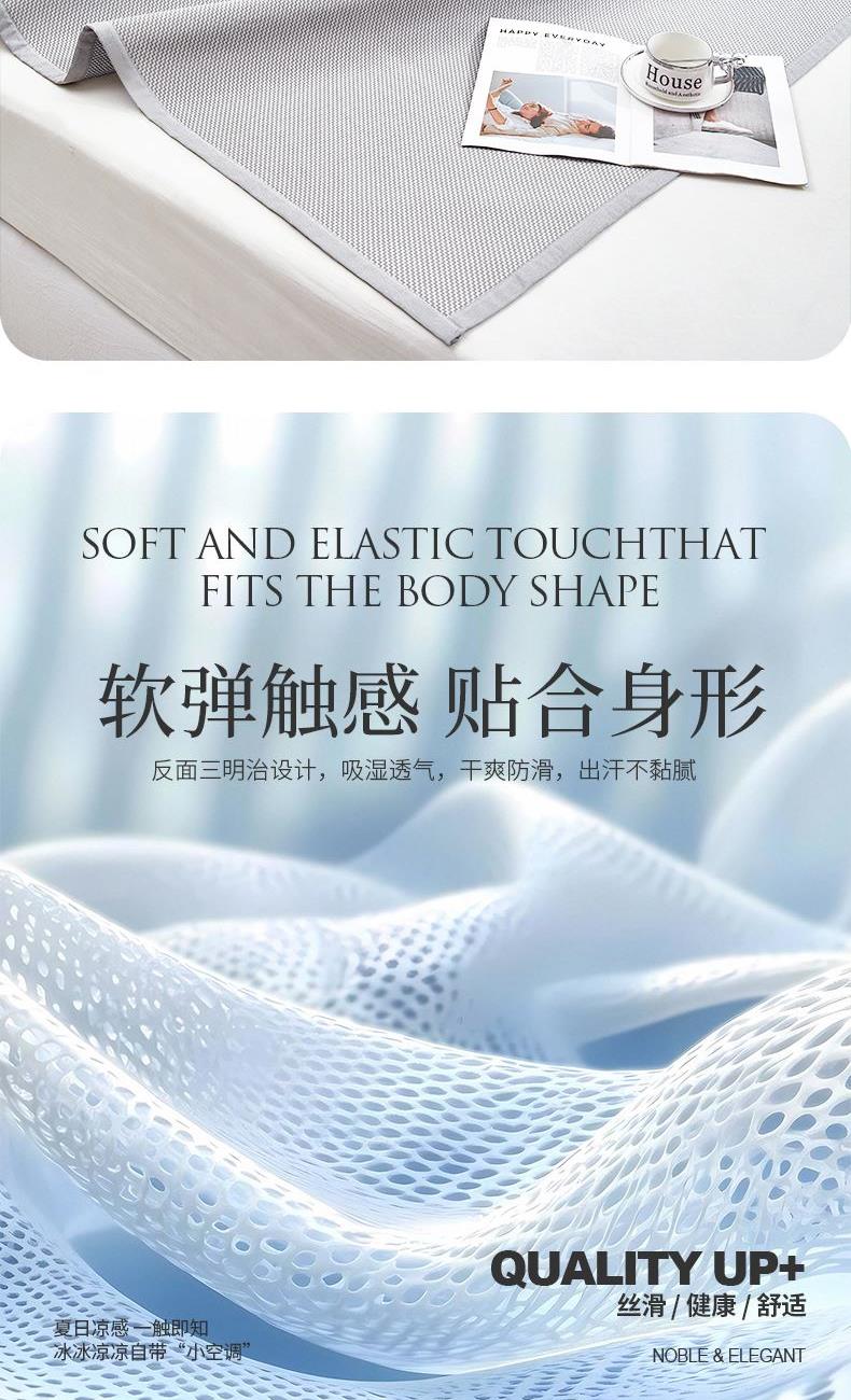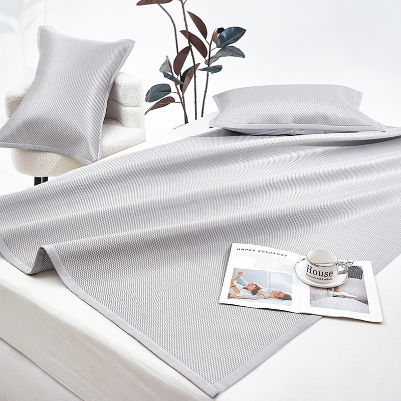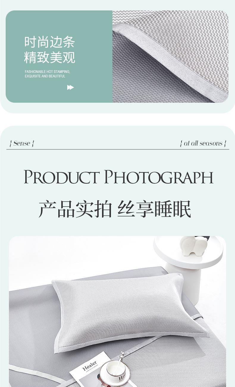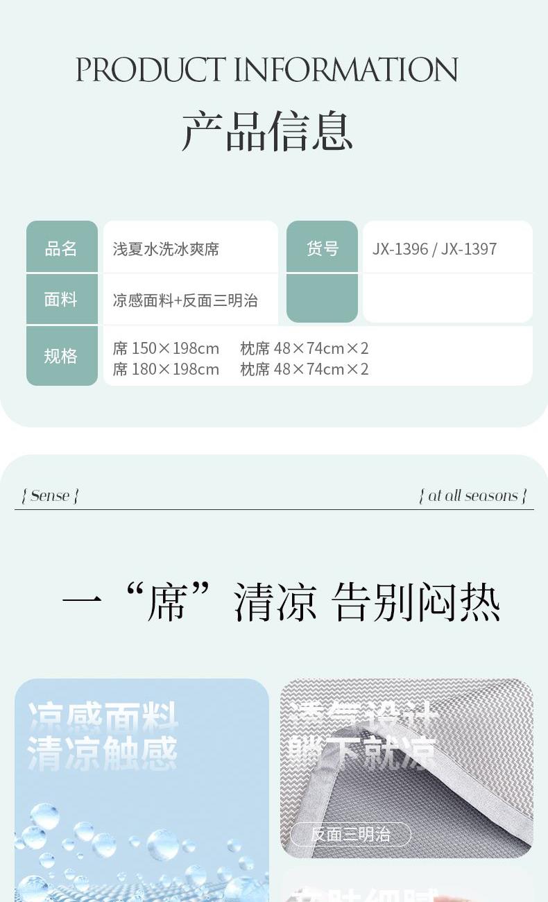 貨 號:JX-1397 規(guī) 格:席180×198cm (1.8米) 枕席48×74cm×2 材 質(zhì):涼感面料+反面三明治 反面三明治設(shè)計,絲滑舒適 涼感面料為中空結(jié)構(gòu),細膩柔滑的觸感,干爽透氣,吸汗吸濕,涼而不冰,瞬間趕走疲憊、新一代降溫放熱材質(zhì),從而給予很好的熱傳導(dǎo)性,能增加皮膚的冷感,輕松可水洗。
