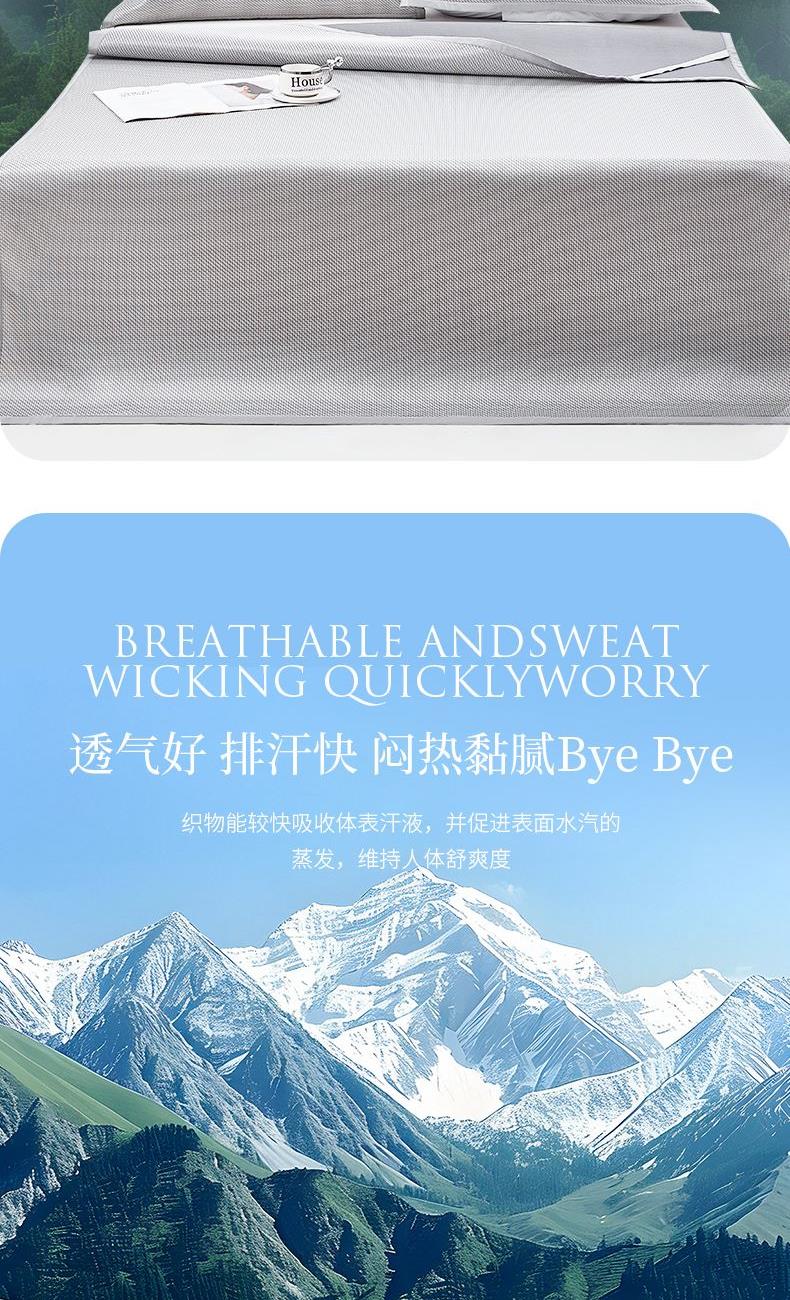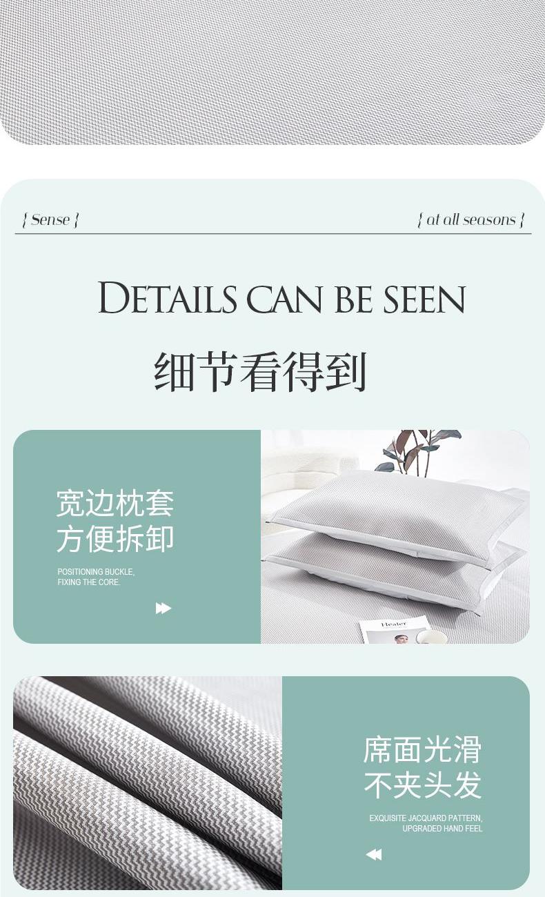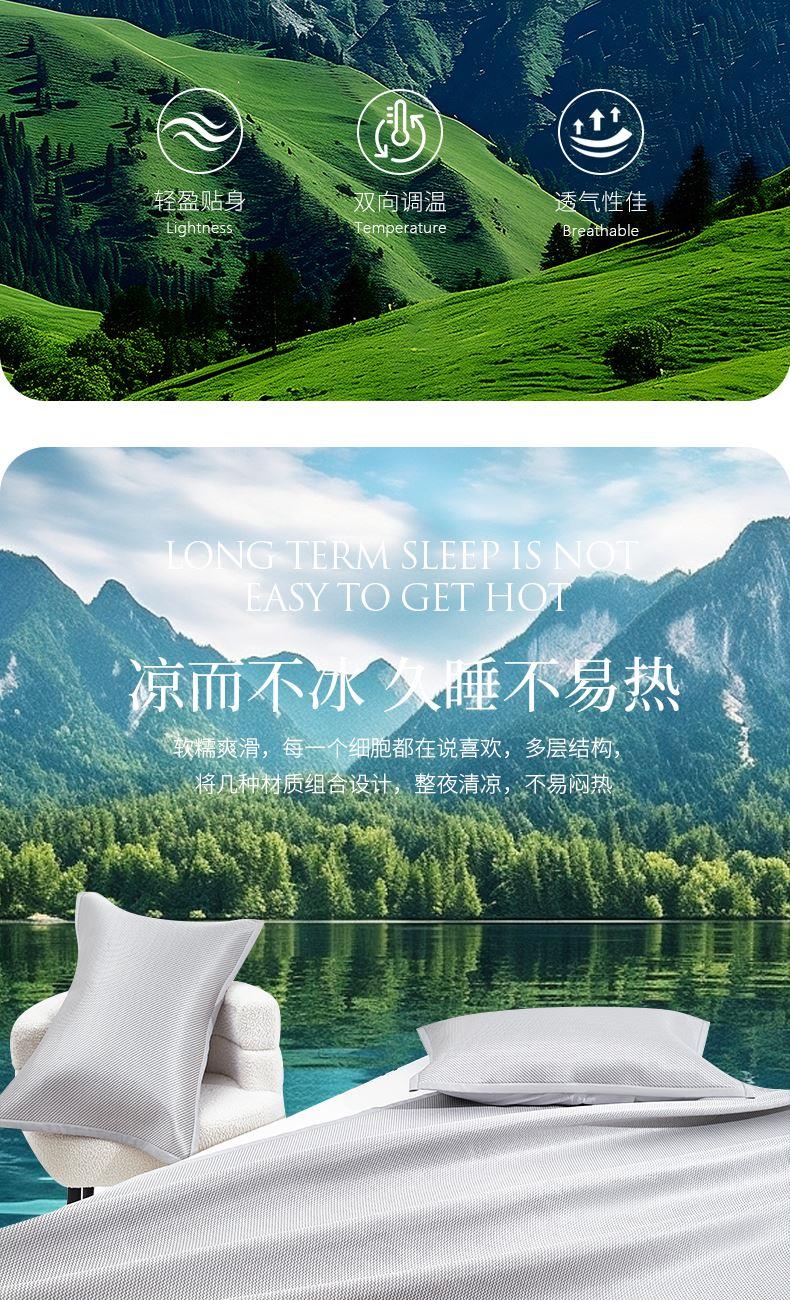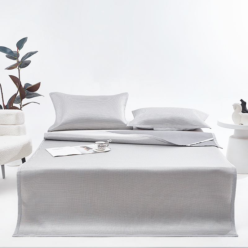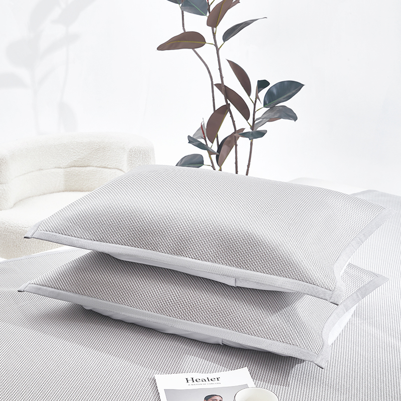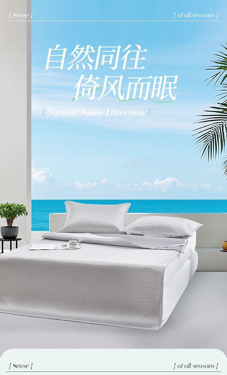 貨 號:JX-1397 規(guī) 格:席180×198cm (1.8米) 枕席48×74cm×2 材 質(zhì):涼感面料+反面三明治 反面三明治設(shè)計,絲滑舒適 涼感面料為中空結(jié)構(gòu),細膩柔滑的觸感,干爽透氣,吸汗吸濕,涼而不冰,瞬間趕走疲憊、新一代降溫放熱材質(zhì),從而給予很好的熱傳導(dǎo)性,能增加皮膚的冷感,輕松可水洗。