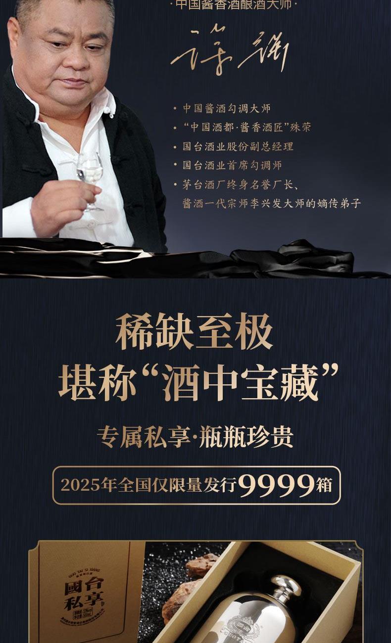 國臺私享酒,稀缺至極, 堪稱“酒中寶藏”每一瓶國臺私享酒背面都印有專屬的獨立編號,并且每瓶都印有中國釀酒大師“徐強”的本人簽名。國臺私享酒,專屬私享,瓶瓶珍貴,2025年全國限量發(fā)行9999箱,喝一瓶少一瓶,囤一箱少一箱,極具收藏價值。
