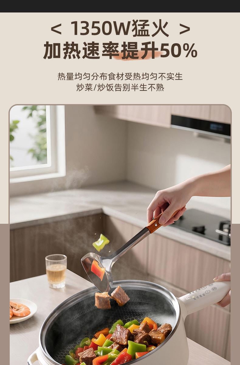 1350W 大火力爆炒:底部整圈發(fā)熱,火力強勁夠猛,顛鍋爆炒不輸明火