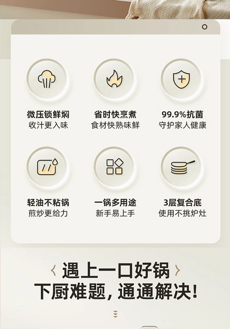 三層一體壓鑄加厚底:受熱均勻不糊底,導(dǎo)熱穩(wěn)定,烹飪口感更出色