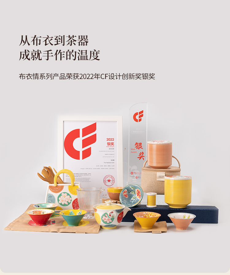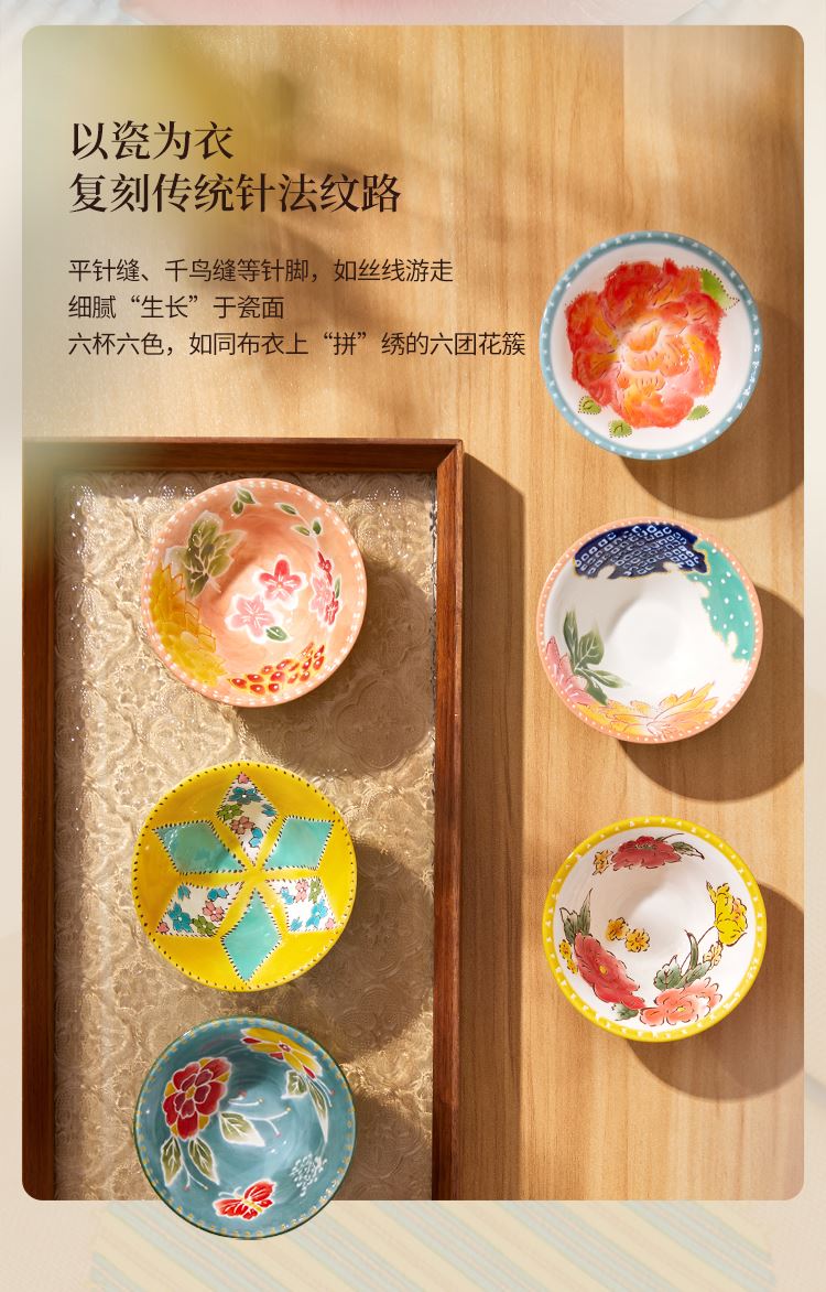 4.六個杯子六種花色,就像布衣上“拼”起來的六團(tuán)花,喝茶時可依人喜好,各選其杯,喝茶別有意趣。