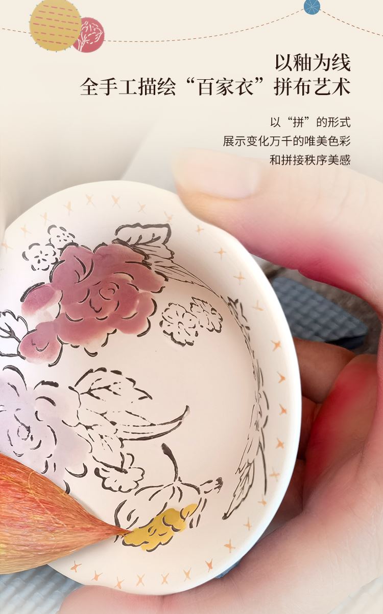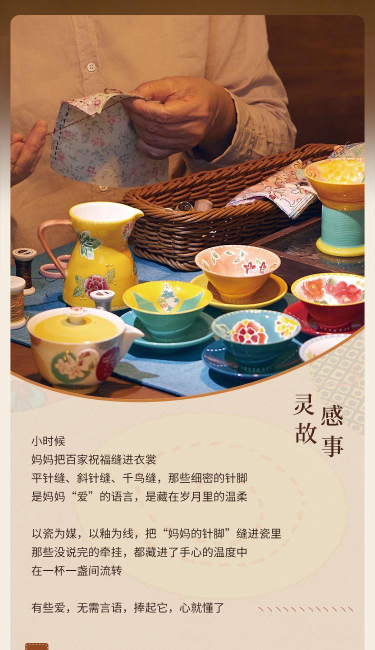 精美圖案;線條精巧靈動,勾勒出平針縫 / 斜針縫 / 千鳥縫的細(xì)膩針跡,仿若媽媽縫補的針腳在瓷面上新生。