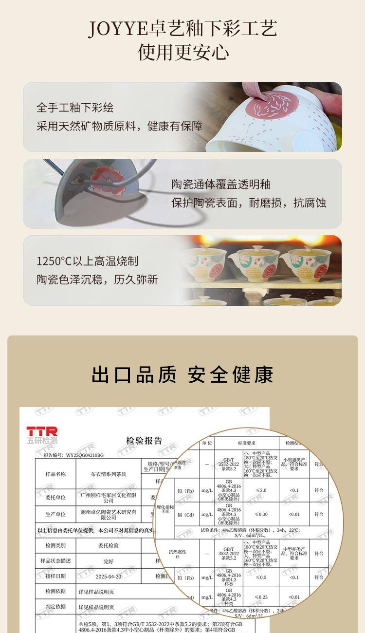 1.全手工釉下彩繪,器物花面精巧,杯內(nèi)花面各異,如同在陶瓷上縫就布衣的