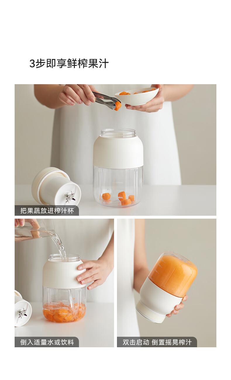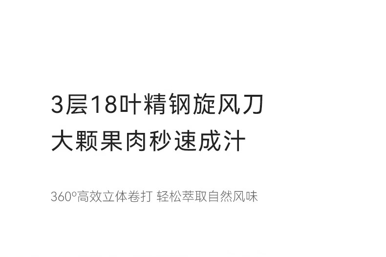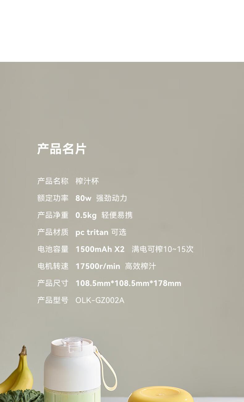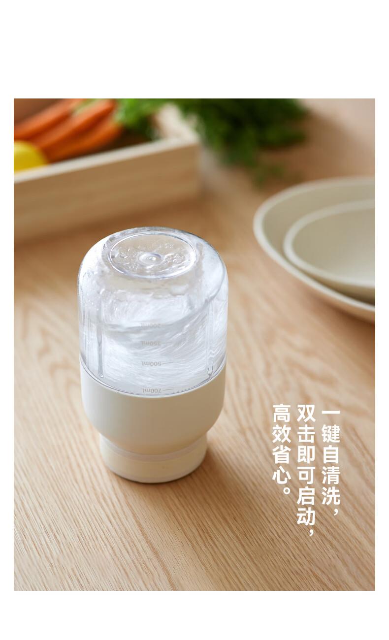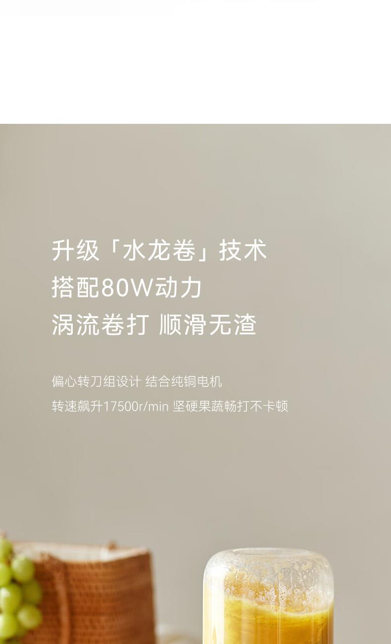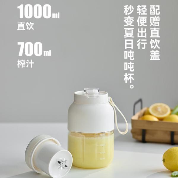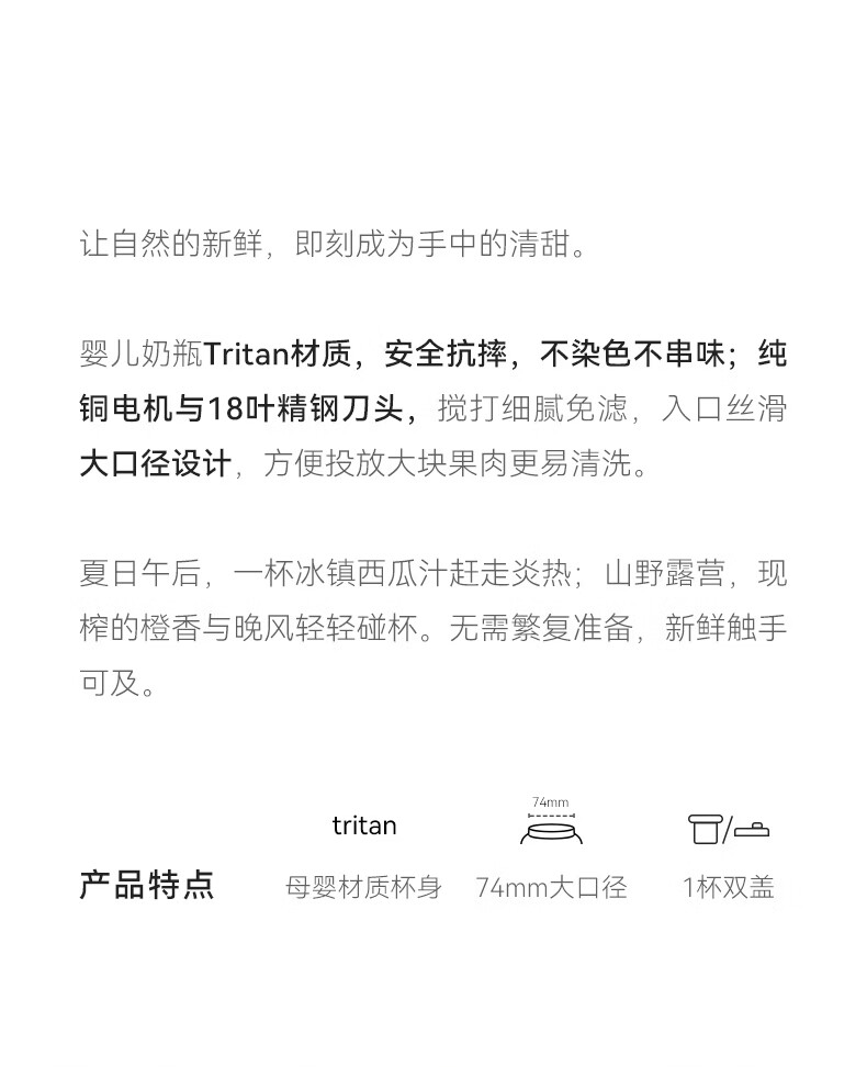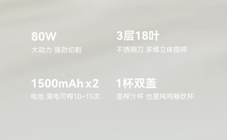 顏色:陶白色 容量:1L 毛重:0.6kg 電池容量:3000mAh 額定功率:80W 產(chǎn)品尺寸:108.5*108.5*178mm 包裝尺寸:250*118*118mm 條碼 : 6977735713090 1. 304精鋼刀頭,3層18葉旋風(fēng)刀片 2. 一杯雙蓋兩用,榨汁/飲水隨意切換 3. 3000mAh長續(xù)航,純銅電機(jī)17500轉(zhuǎn)/分鐘動(dòng)力