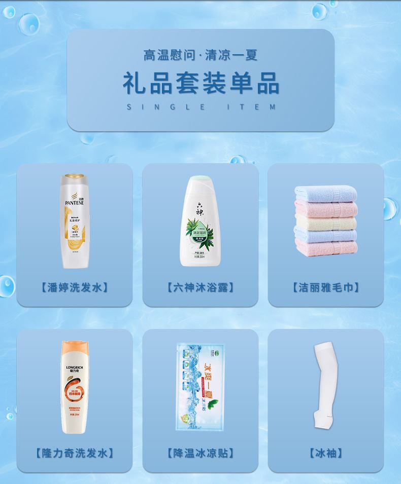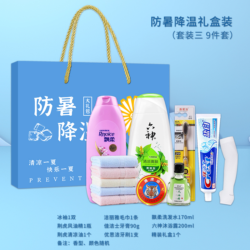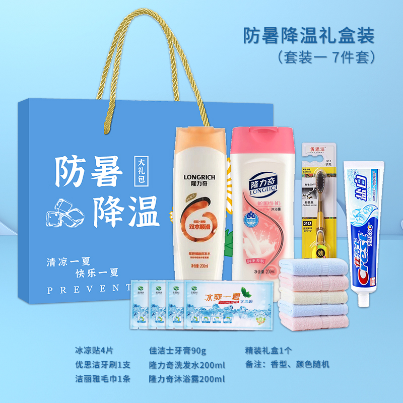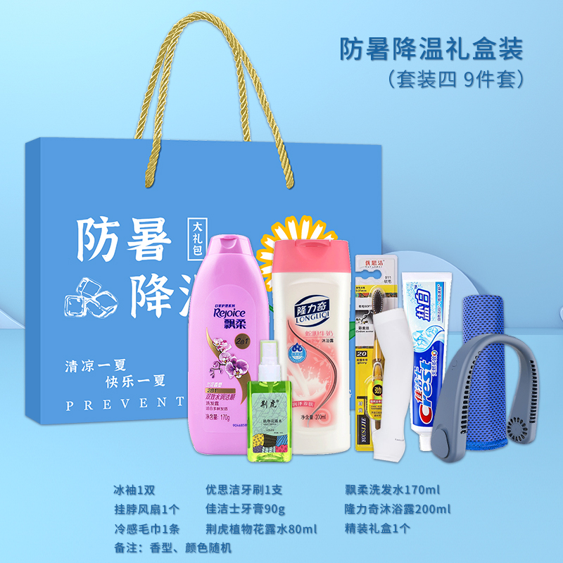 3.首圖款式產(chǎn)品明細(xì):防暑降溫禮盒裝(套裝二 10件套):隆力奇洗發(fā)水200ml,冷感毛巾1條,冰袖1雙,精裝禮盒1個(gè),六神沐浴露200ml,荊虎風(fēng)油精1瓶,冰涼貼4片,優(yōu)思潔牙刷1支,荊虎清涼油1個(gè),金銀花潤喉糖1盒