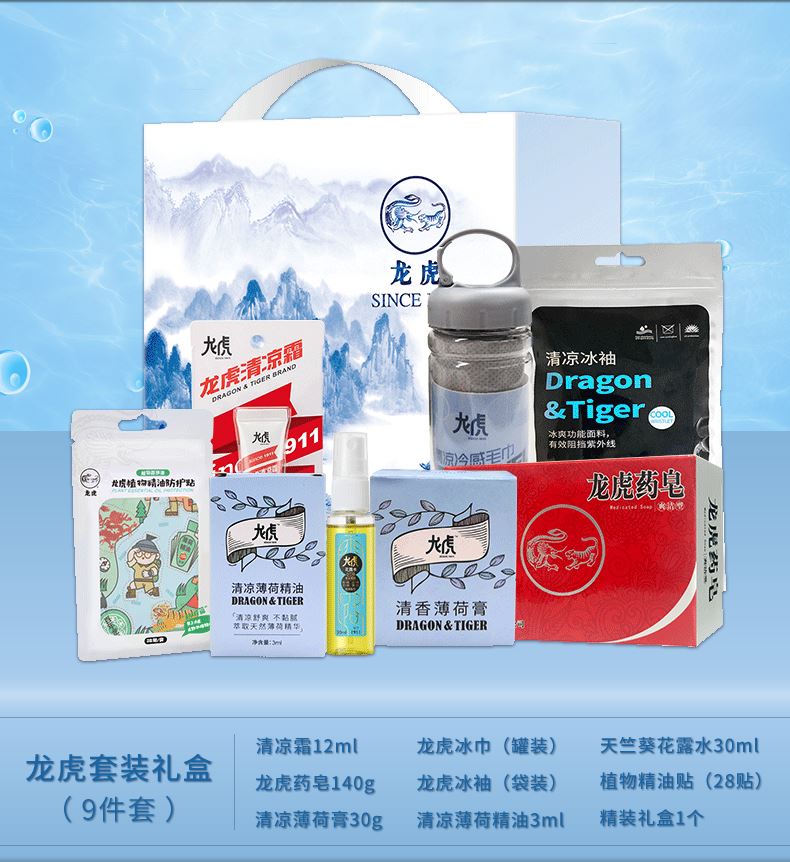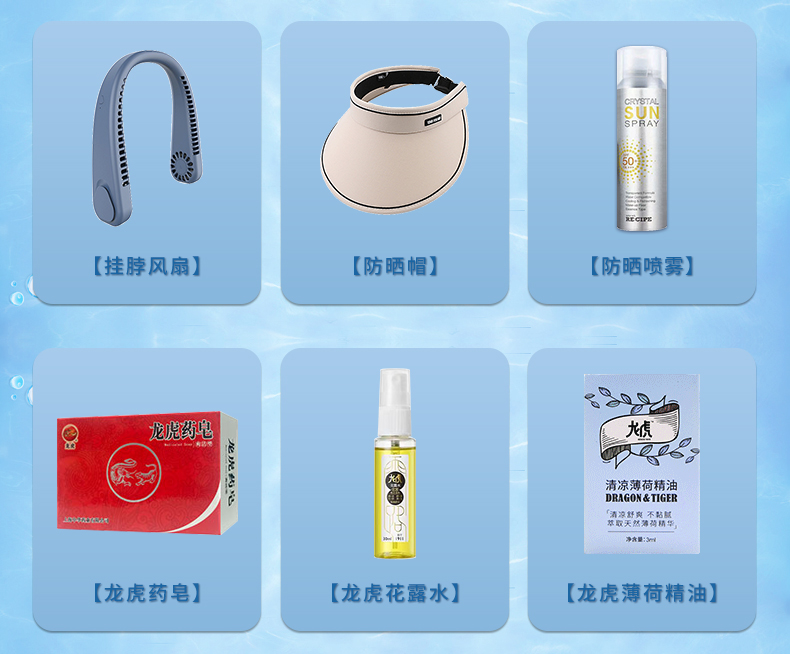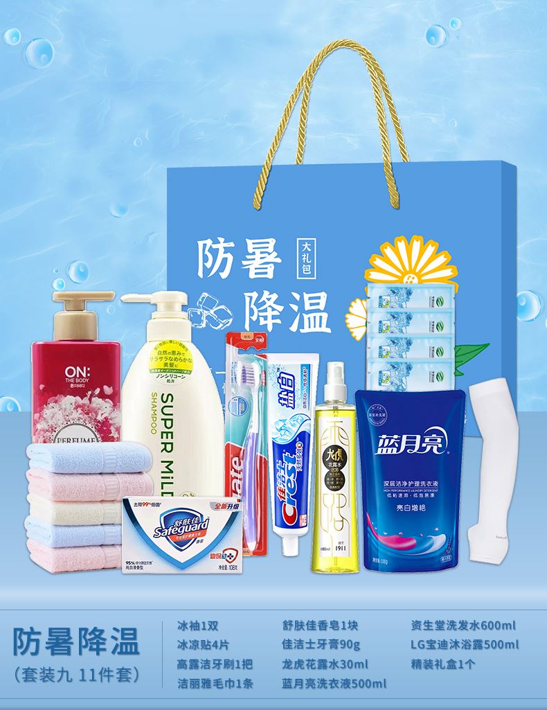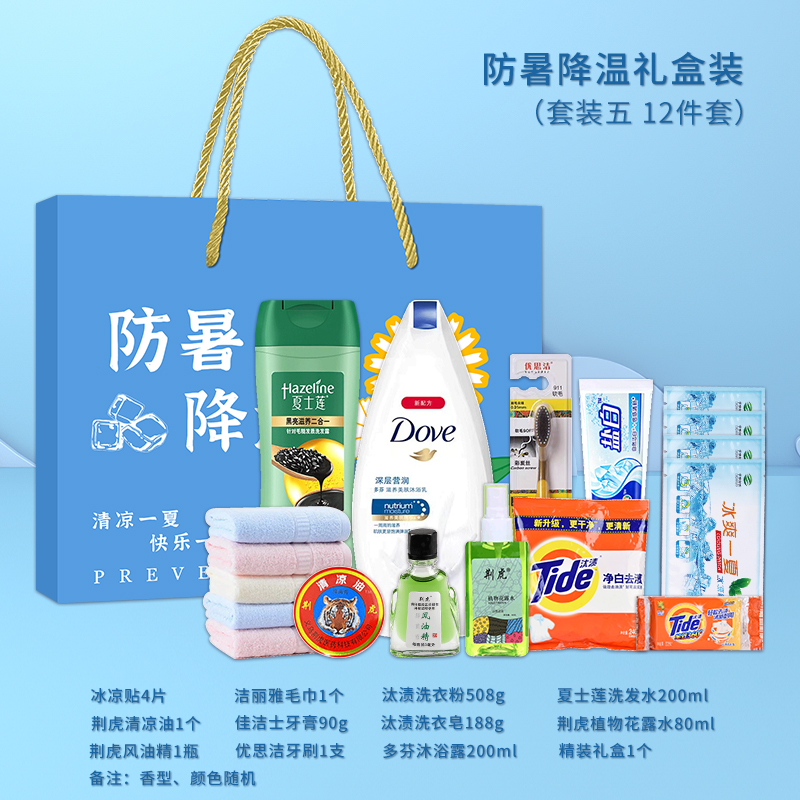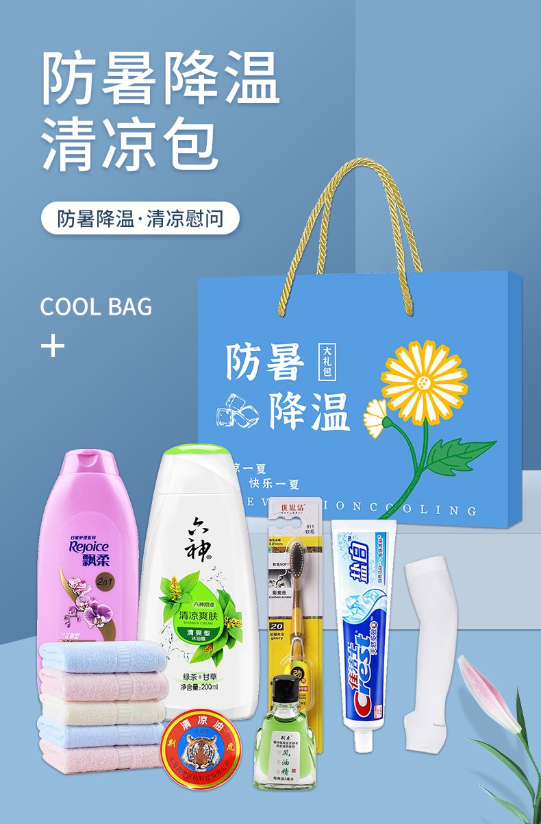 3.首圖款式產(chǎn)品明細(xì):防暑降溫禮盒裝(套裝二 10件套):隆力奇洗發(fā)水200ml,冷感毛巾1條,冰袖1雙,精裝禮盒1個(gè),六神沐浴露200ml,荊虎風(fēng)油精1瓶,冰涼貼4片,優(yōu)思潔牙刷1支,荊虎清涼油1個(gè),金銀花潤喉糖1盒
