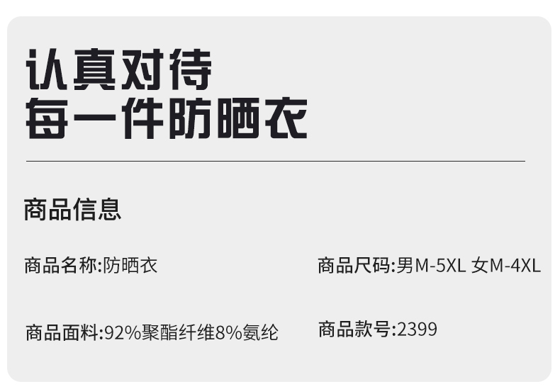 產(chǎn)品賣點(diǎn): 高性價比 顏色絢麗 原紗防曬到加寬加大帽檐 輕薄透氣 拒絕保鮮式防曬 輕量不悶汗 UPF50+高倍防曬 運(yùn)用科技光學(xué)吸收劑 阻隔不同波段 洗滌多次依舊防住大太陽 產(chǎn)品面料:97%聚酯纖維 7%氨綸 尺碼:女款M-4XL 男款M-5XL