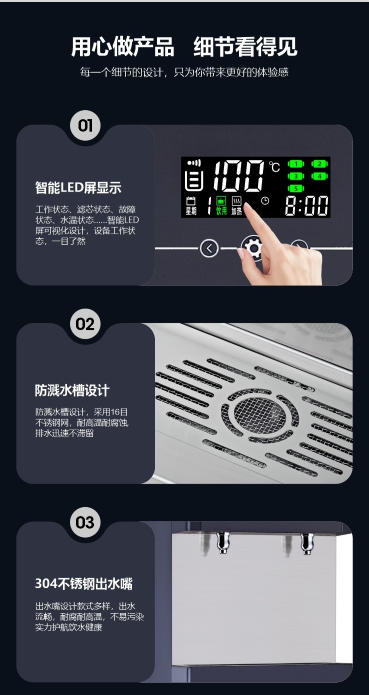 出水形式: 觸摸式出水、開(kāi)水帶童鎖,鋼化玻