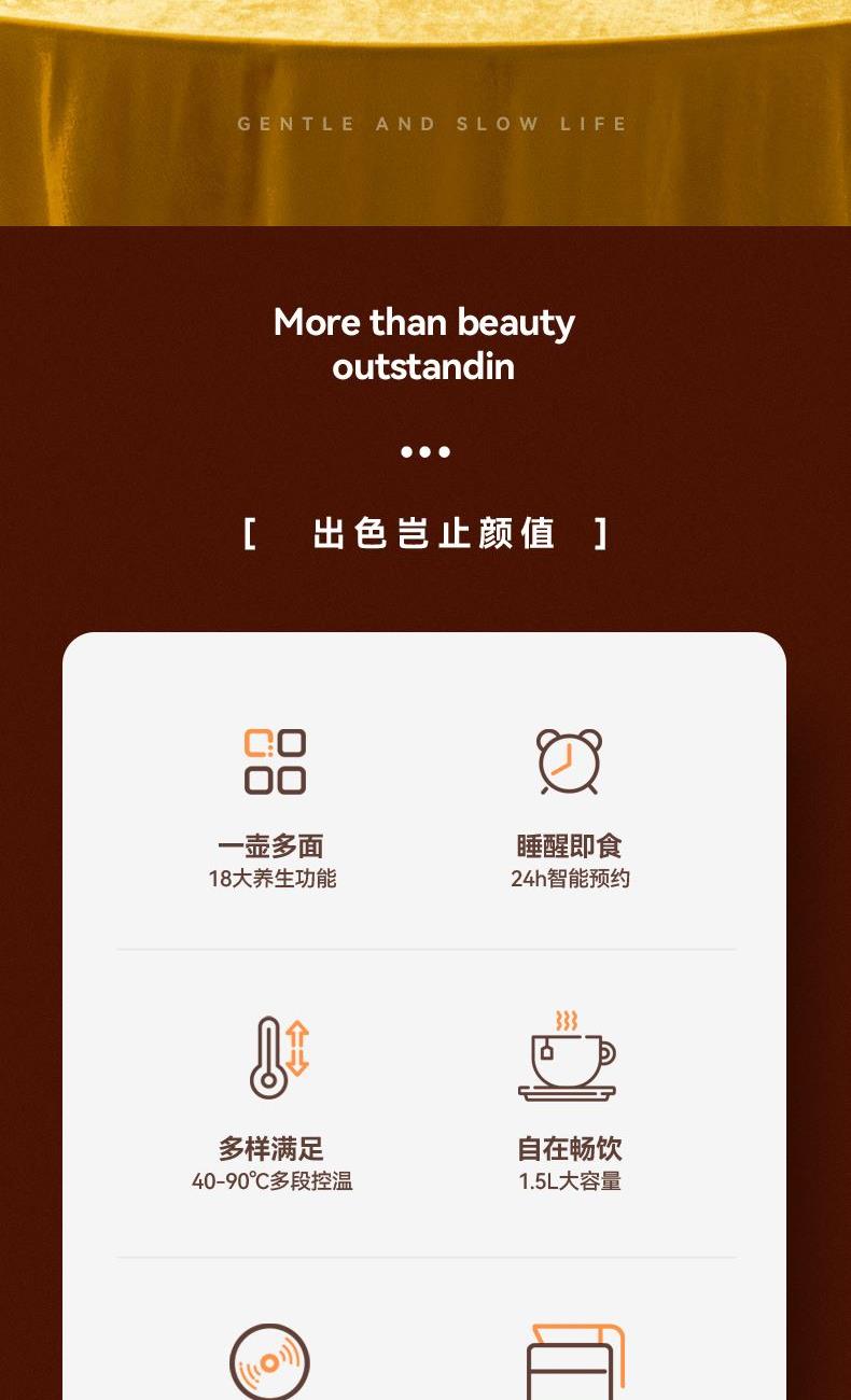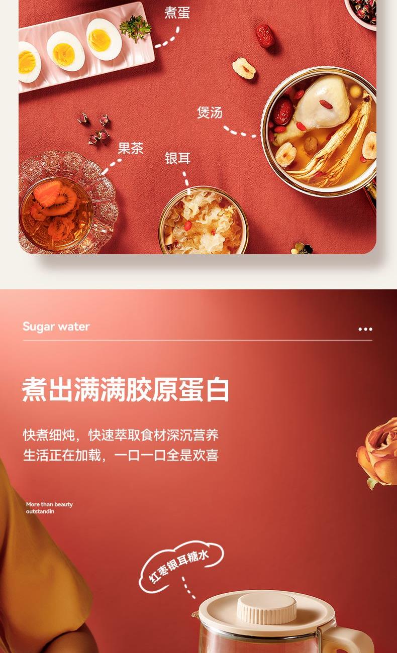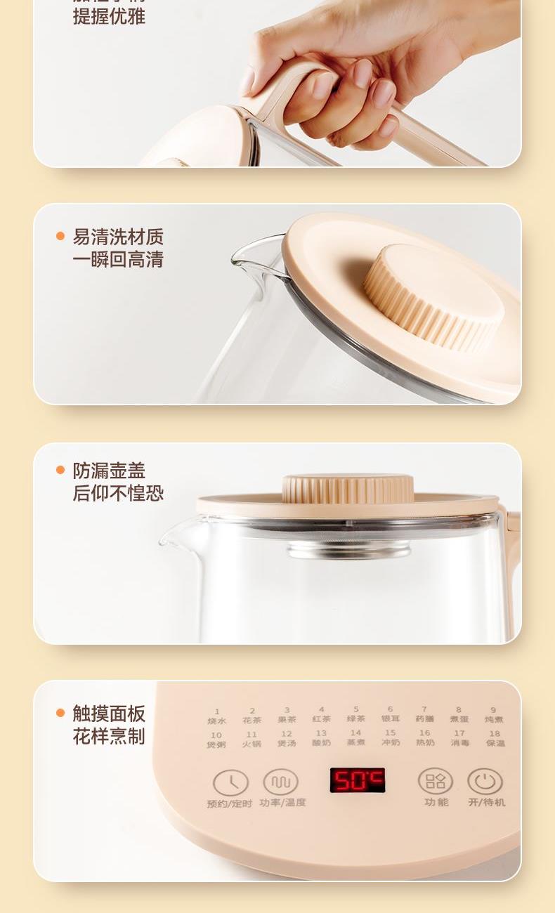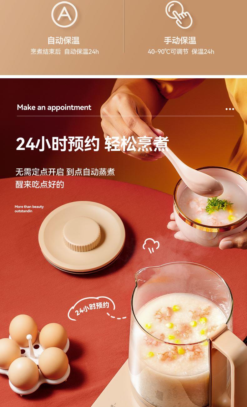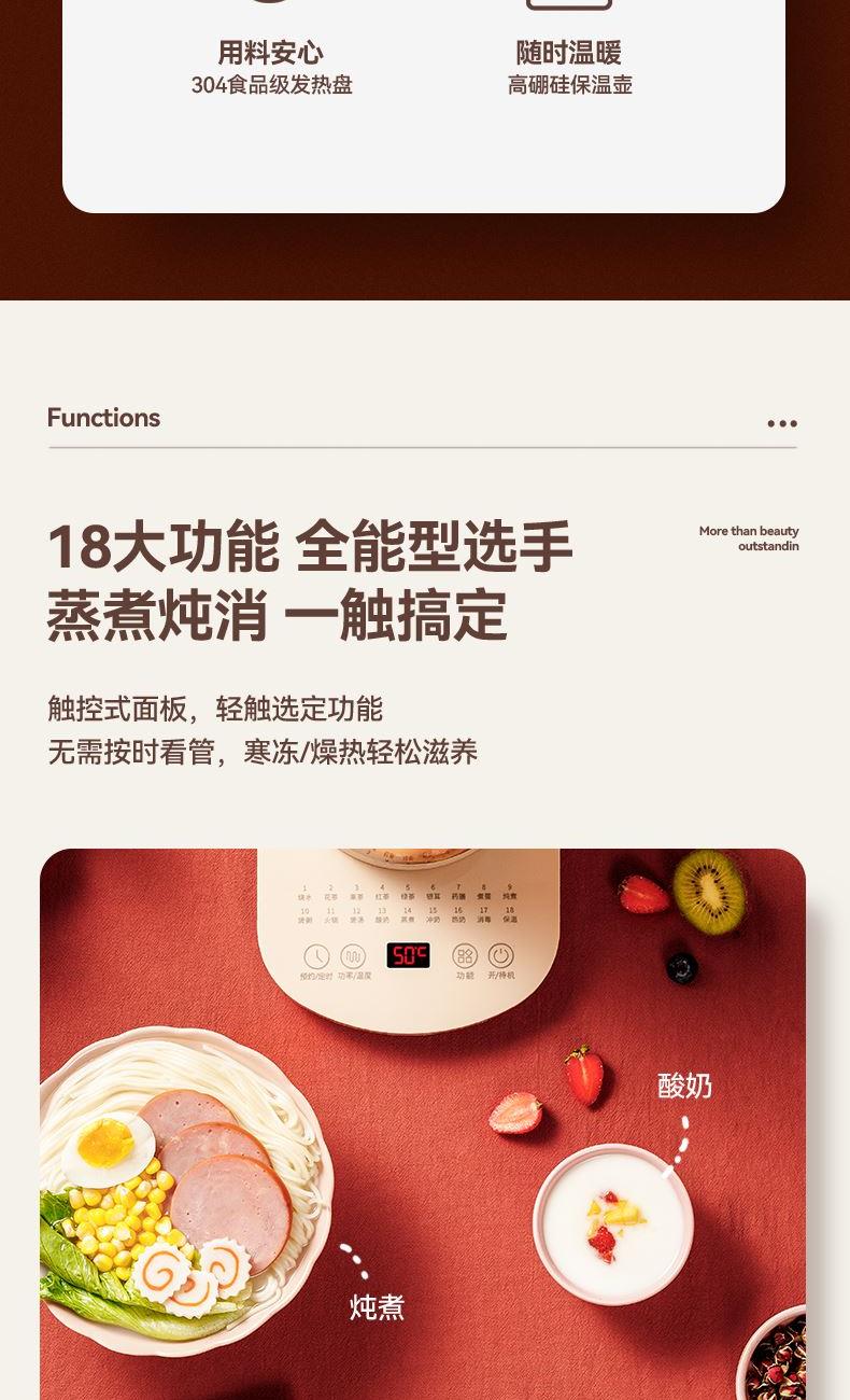 產(chǎn)品容量:1.8L 額定電源:220v~/50Hz 額定功率:800w 控制方式:觸控面板控制 底座尺寸:寬19cm/長(zhǎng)24.5cm 整機(jī)尺寸:24.5*19*24cm 全食品級(jí)304不銹鋼,高硼硅玻璃 11段智能保溫,滿足各種需求 8段功率調(diào)節(jié),2小時(shí)定時(shí),18大功能, 24小時(shí)預(yù)約 贈(zèng)品:蛋架、除垢劑