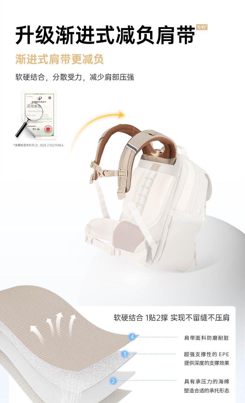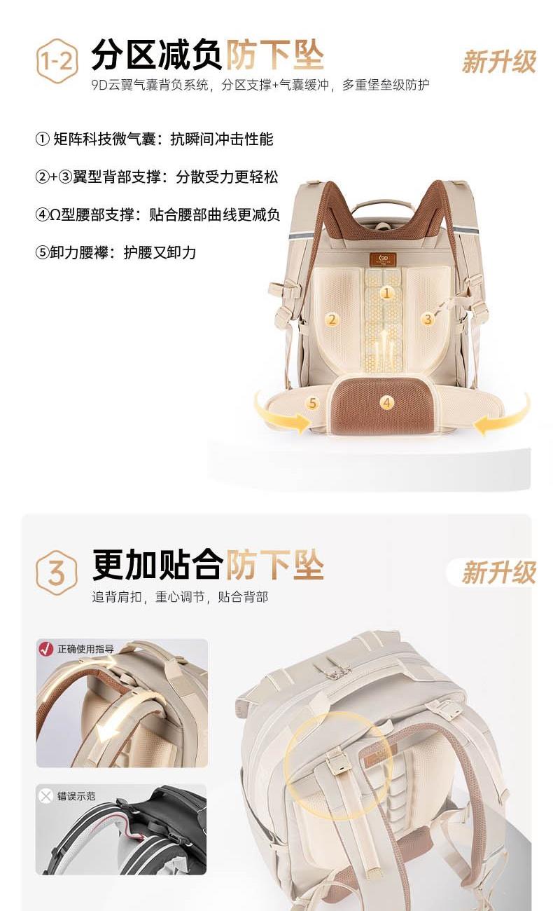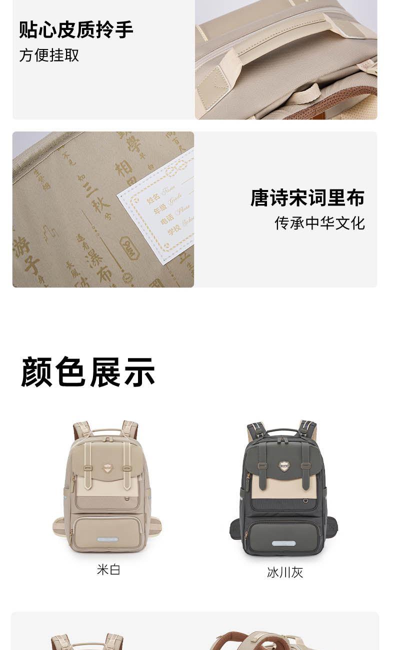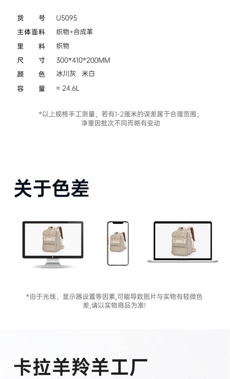 貨號:U5095 主體面料:織物+合成革 里料:織物 顏色:米白 冰川灰 定位: 150-175CM以上/初高中功能書包 凈重:0.95kg 24.6L