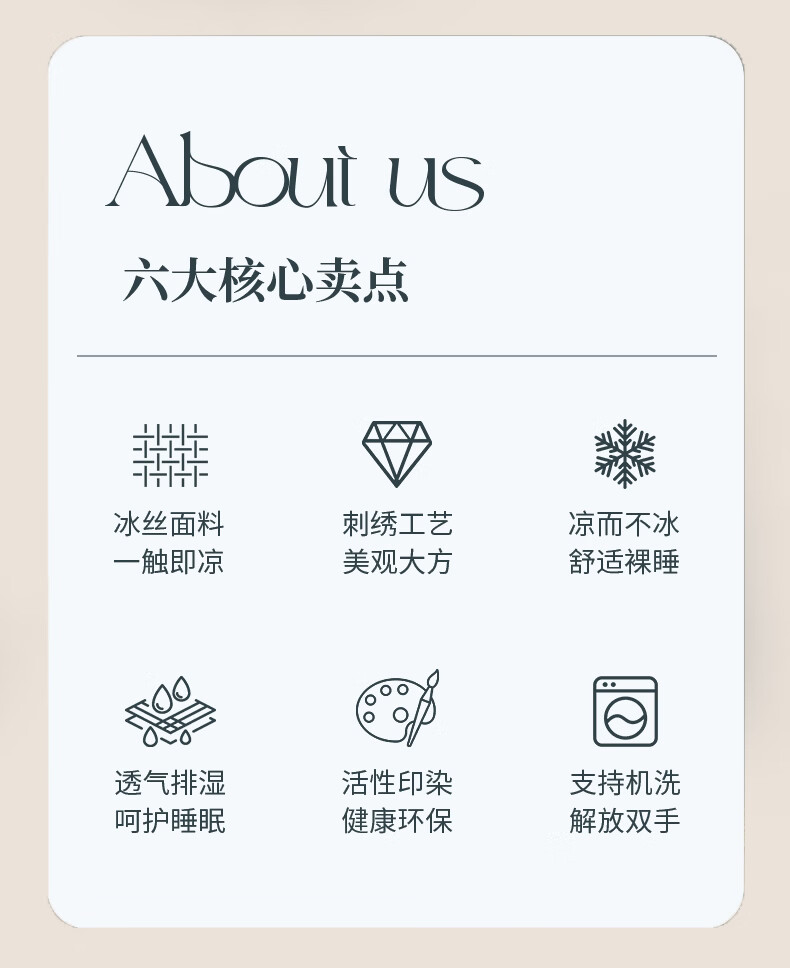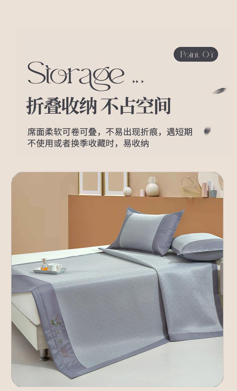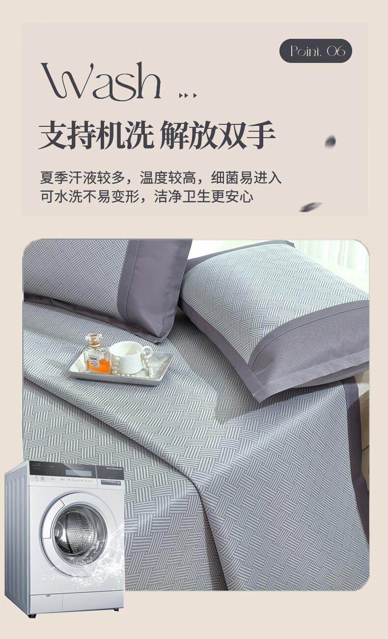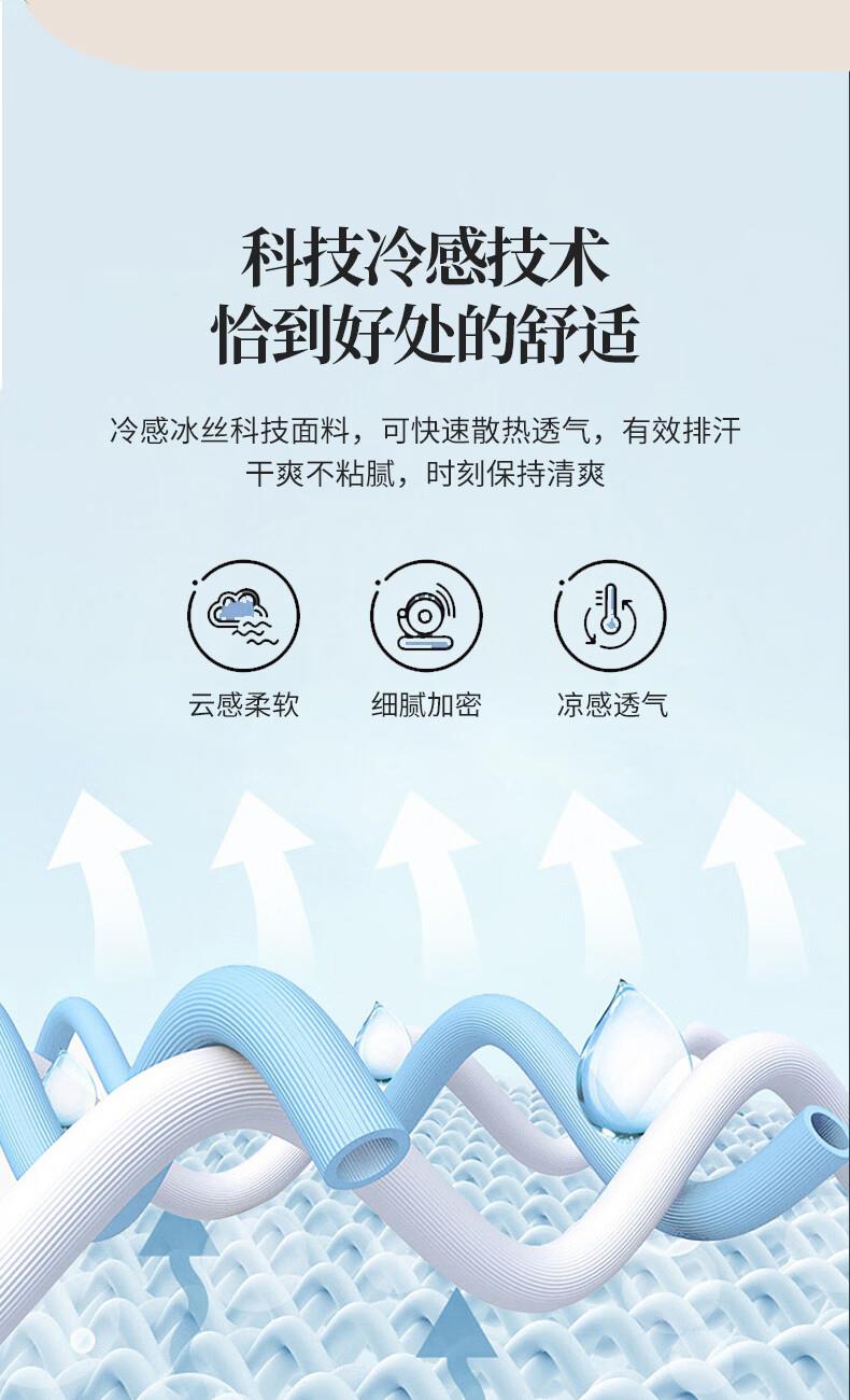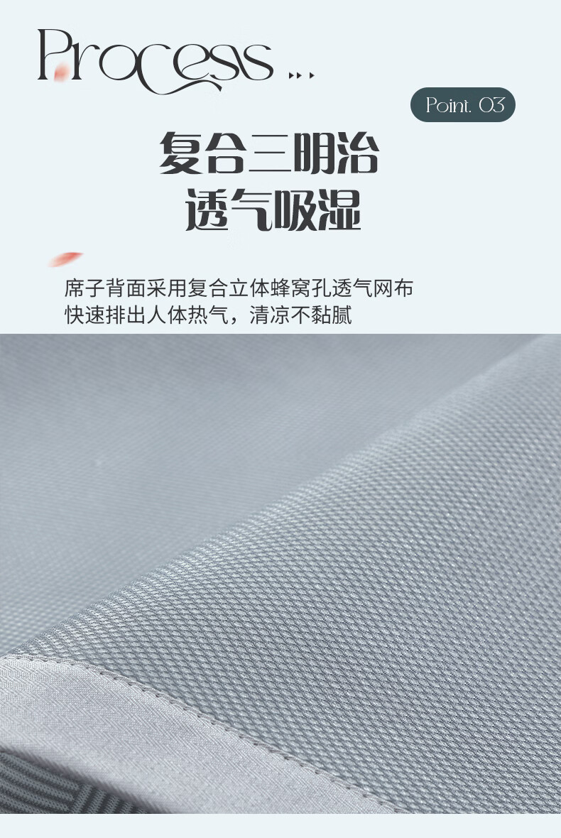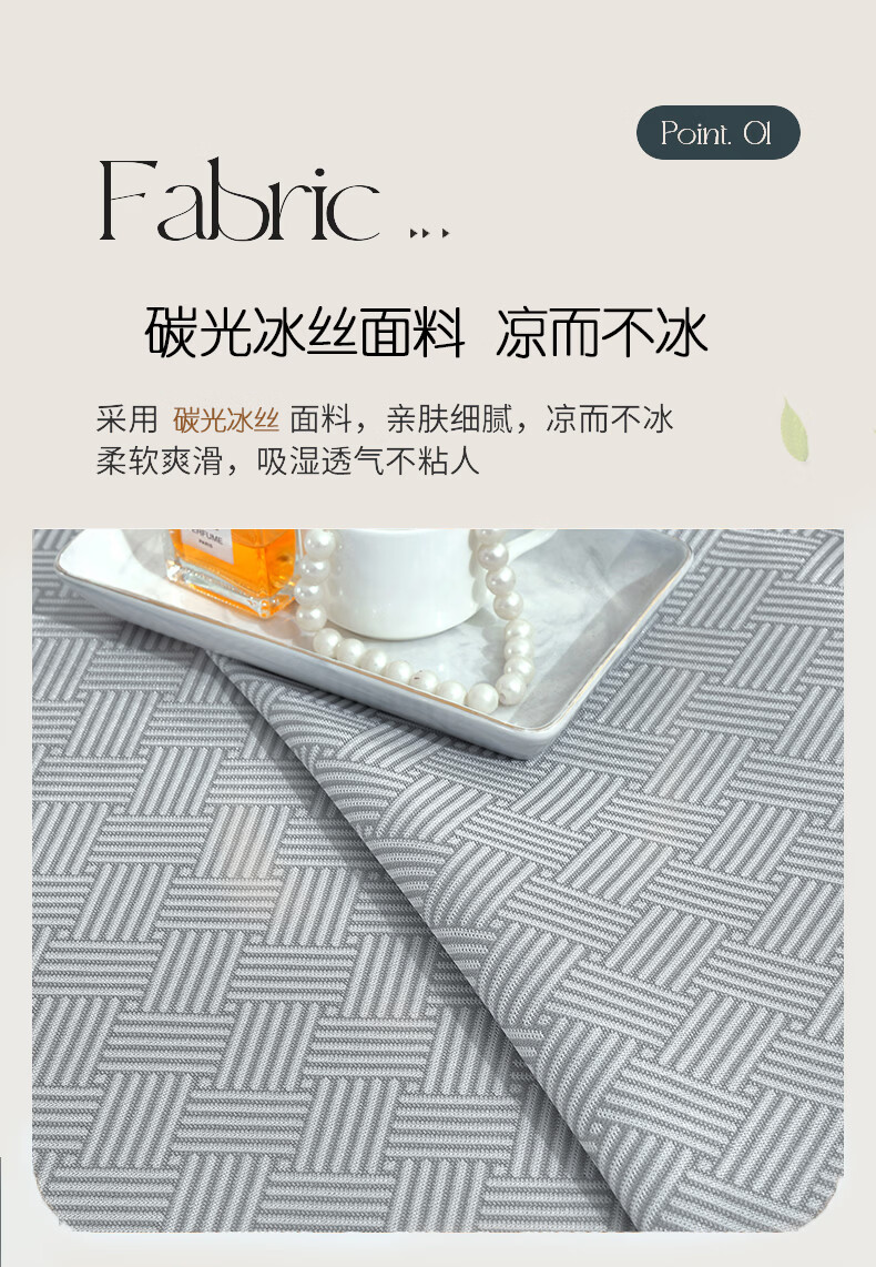 規(guī)格:180*200cm 枕套:48*74cm*2 面料:碳光冰絲 復合料:三明治 執(zhí)行標準:Q/TDY 01-2016 安全類別:GB18401-2010 B類 1.高密碳光冰絲席,自然清涼,涼而不冰,久睡不粘。 2.碳光涼感冰絲纖維織物本身經過處理,可以破壞細菌的寄生環(huán)境,有效防止細菌滋生進入,切斷它們的食物鏈,潔凈衛(wèi)生,適合裸睡。
