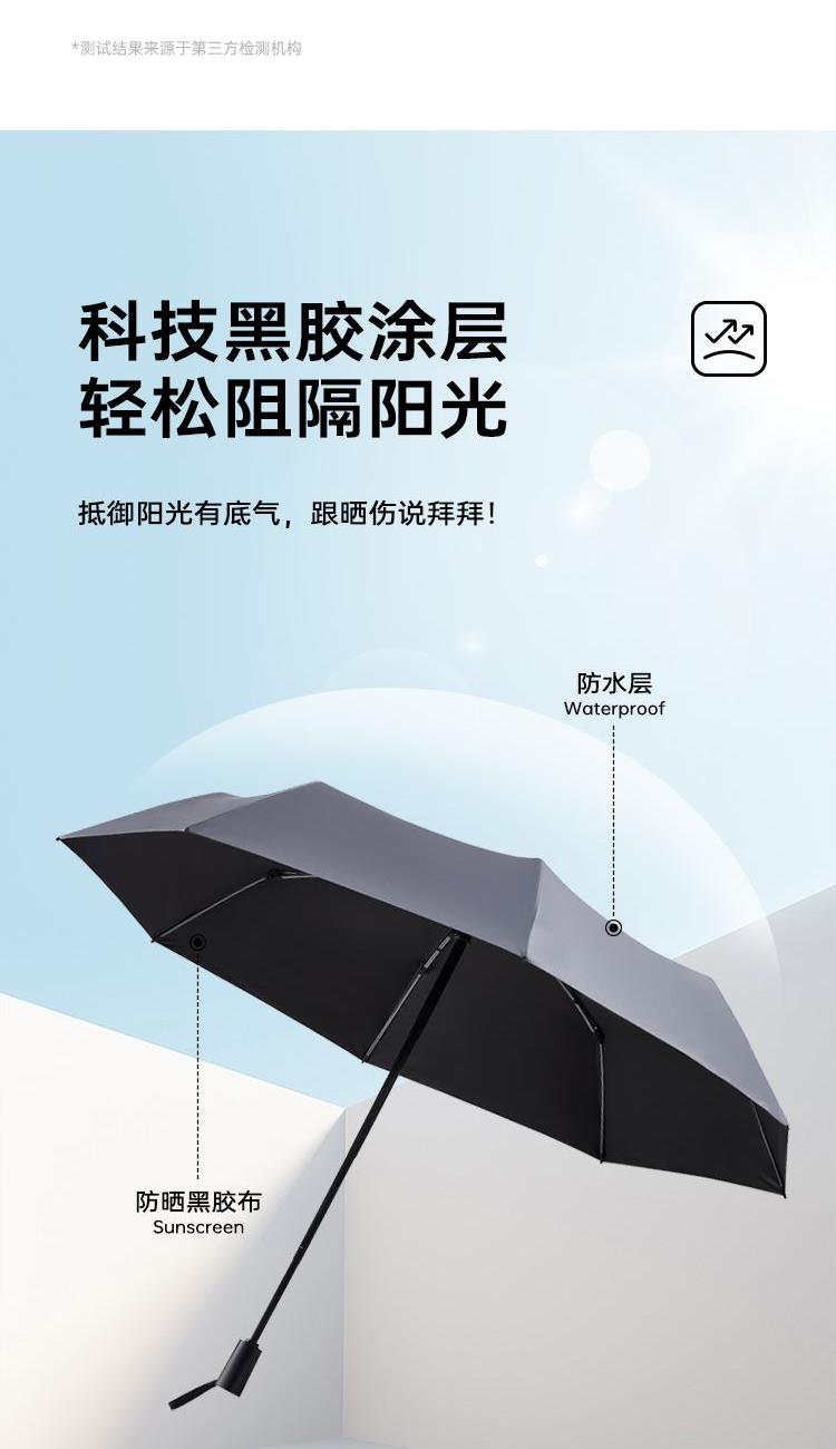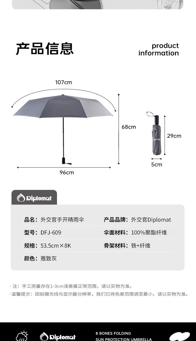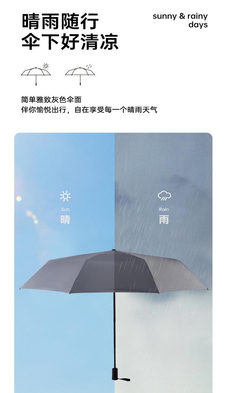 產(chǎn)品尺寸:展開53.5cmx8K 收納29cm 產(chǎn)品材質:聚酯纖維(內涂黑膠)+鐵+纖維 產(chǎn)品顏色:雅致灰 產(chǎn)品包裝:傘套+PE袋 1、升級8骨雙玻纖傘架,抗風能力加強。 2、內涂黑膠,防曬UPF50+,晴雨兩用。 3、精致握把,輕便合手,持握舒適。