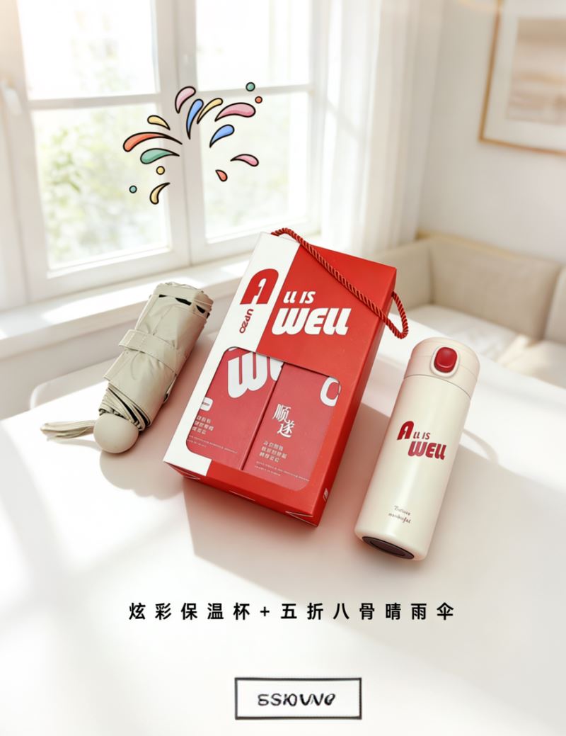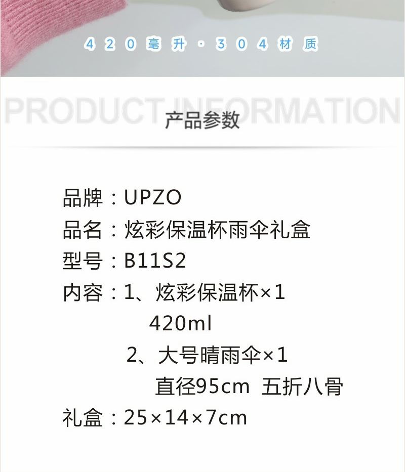 型號: B11S2 產(chǎn)品內(nèi)容 1、 大號晴雨傘 五折八骨 傘下直徑95CM 2、 炫彩保溫杯×1 304內(nèi)膽 PP杯蓋 420毫升容量 外盒: 25×14×7cm 大號晴雨傘主題設計融入 五折八骨大傘 外觀靚麗 實用性強 420毫升高顏值保溫杯 304內(nèi)膽 精美設計文案