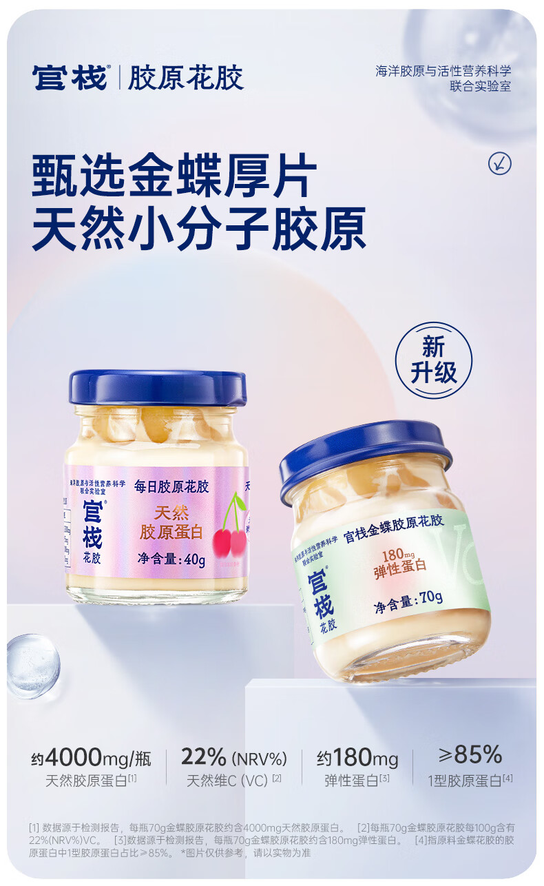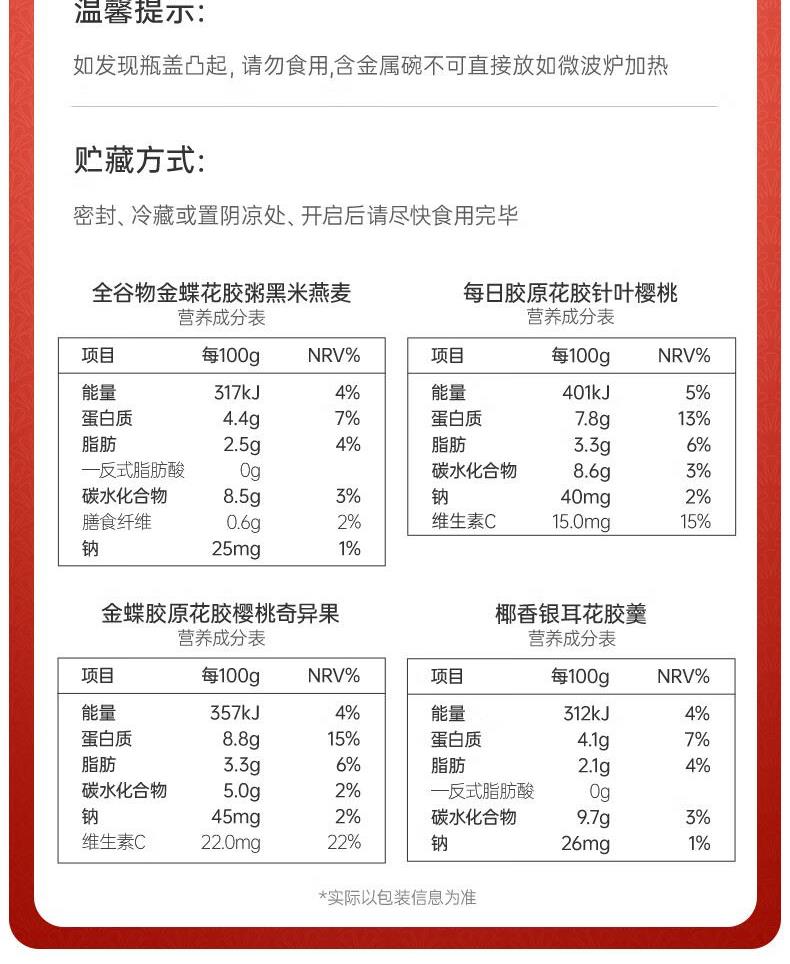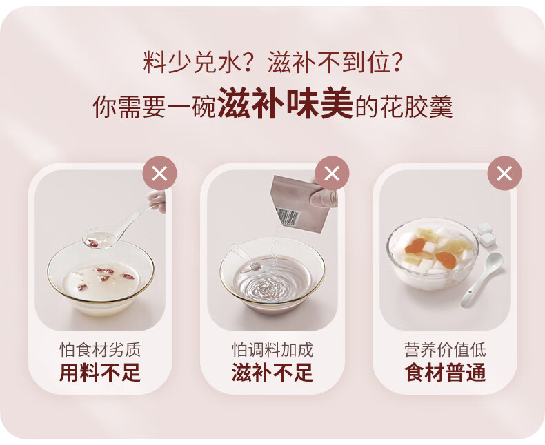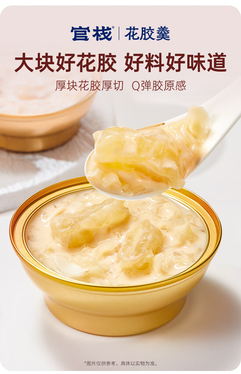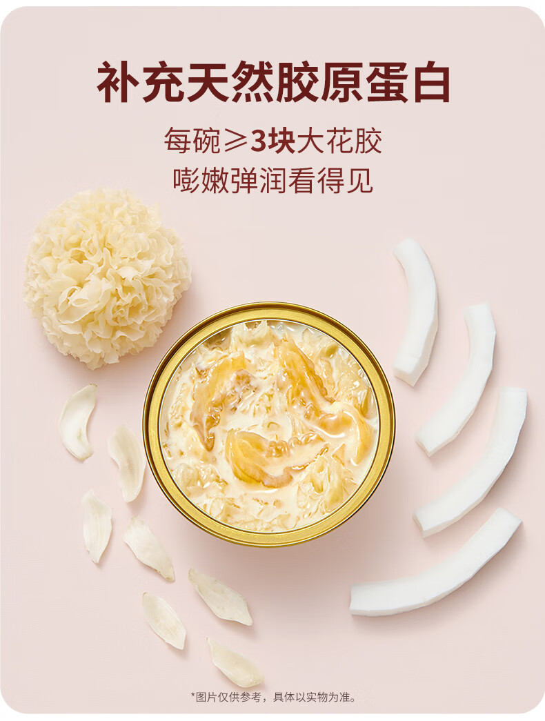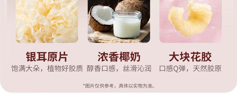 【天然透明質(zhì)酸鈉】膠原花膠含有100mg天然透明質(zhì)酸鈉。肌膚真皮層重要成分,天然保濕因子,水潤?quán)貜?【真材實料】進口查魚白玉膠,大塊厚花膠,膠多黏嘴。 【物理去腥】4D多維滲透去腥技術(shù),好膠原更嘭潤。 【滋補養(yǎng)生】花膠羹椰香銀耳,清潤解燥,補充真實天然膠原蛋白。 【精美禮盒】高性價比,送禮自用皆宜,美味又衛(wèi)生。