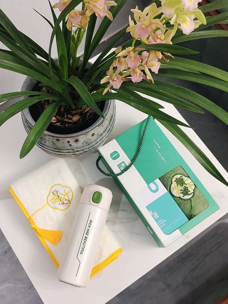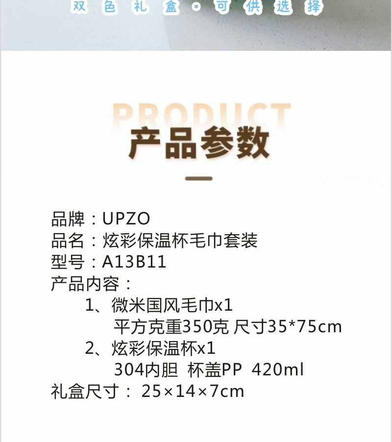 型號(hào): A13B11 產(chǎn)品內(nèi)容 1、 微米國風(fēng)系列毛巾×1 微米紗 平方克重350克 規(guī)格35*75CM 2、 靚彩保溫杯×1 304內(nèi)膽 PP杯蓋 420毫升容量 外盒: 25×14×7cm 炫彩保溫杯設(shè)計(jì)融入祝福 外觀和品質(zhì)同在 國風(fēng)微米毛巾融入祝福理念 面料升級(jí) 精工刺繡 為生活添彩
