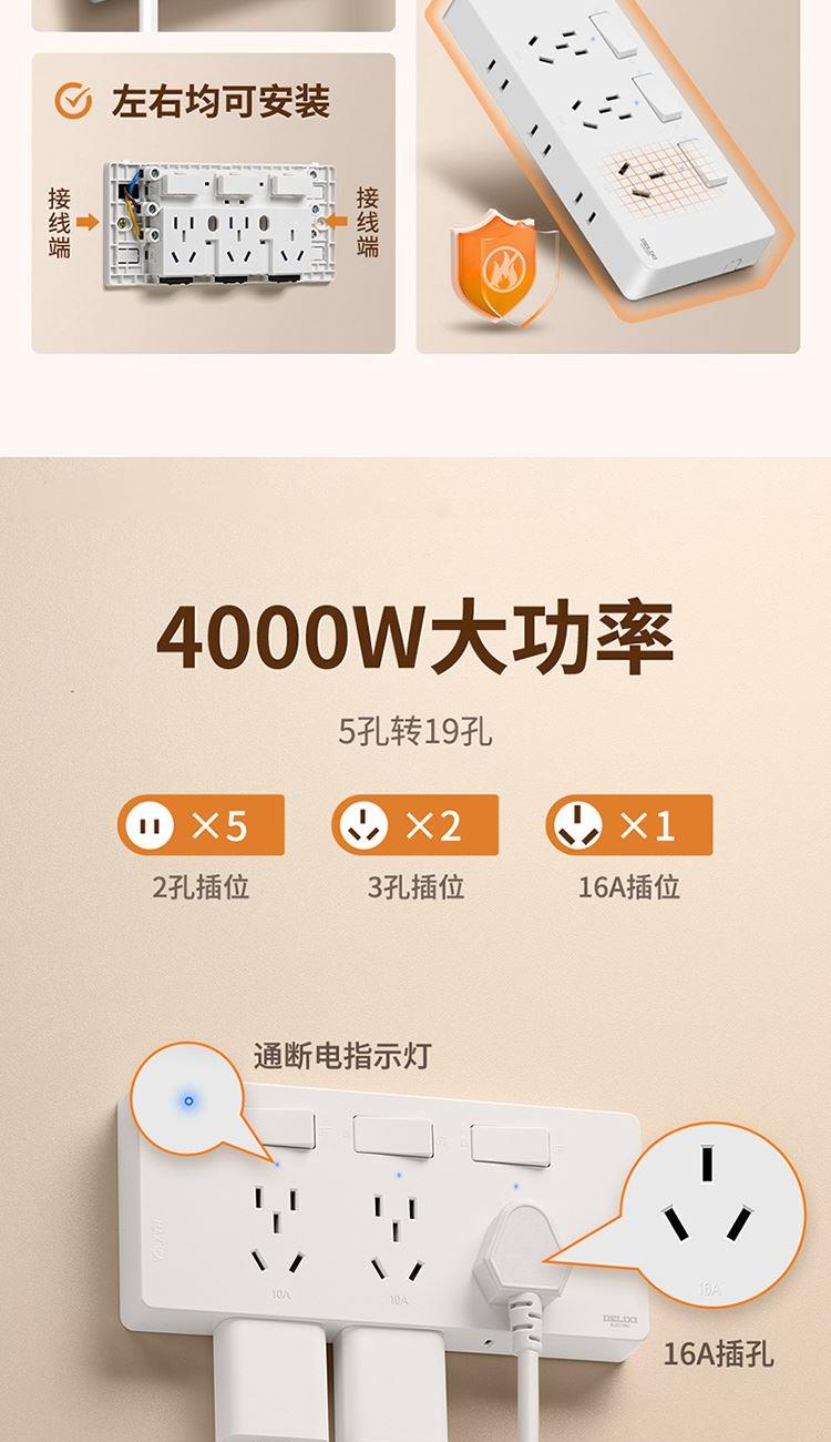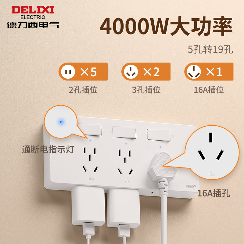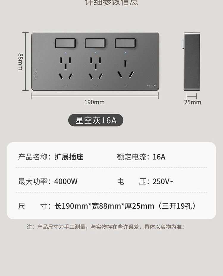 產(chǎn)品:德力西電氣 DETC系列十六孔插座10A+三孔插座16A (星空灰) 品 牌:德力西電氣 產(chǎn)品型號:DETC-X16S1(H) 額定電流:16A 額定電壓:250V 插座尺寸:190*88*25mm 產(chǎn)品位數(shù):一位三孔(16A)、兩位五孔、三位兩孔、無線(需要自行接線)