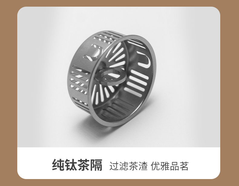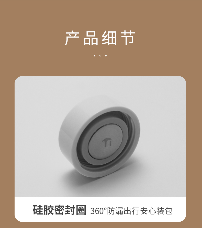 · 硅膠密封圈, 360°防漏,出行安心裝包。 · 純鈦茶隔,過濾茶渣, 優(yōu)雅品茗。 · 圓潤杯口,光滑細(xì)膩, 觸感舒適。 · 硅膠底墊,放置穩(wěn)固, 防滑耐磨。