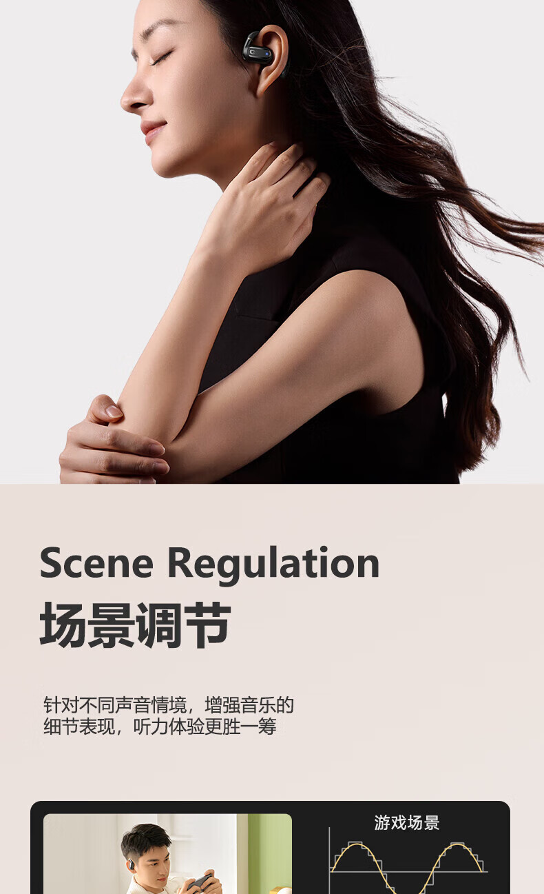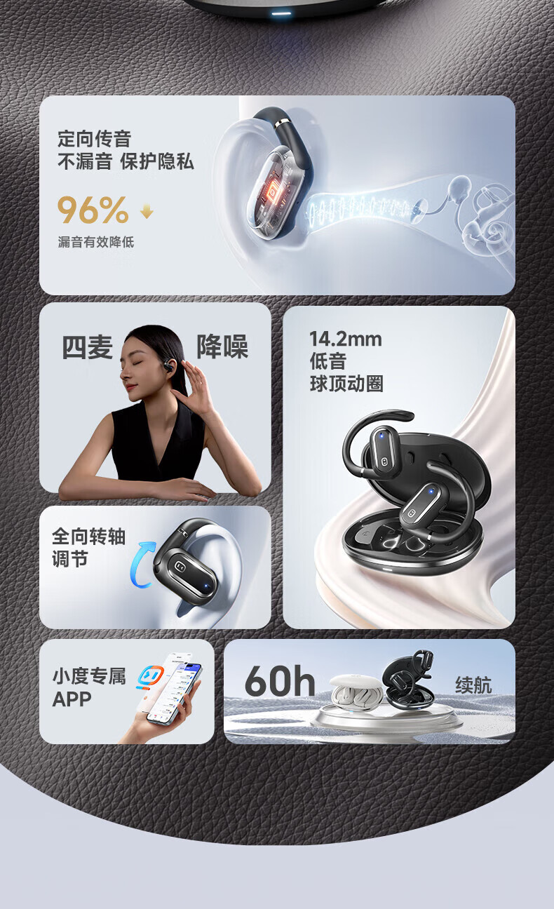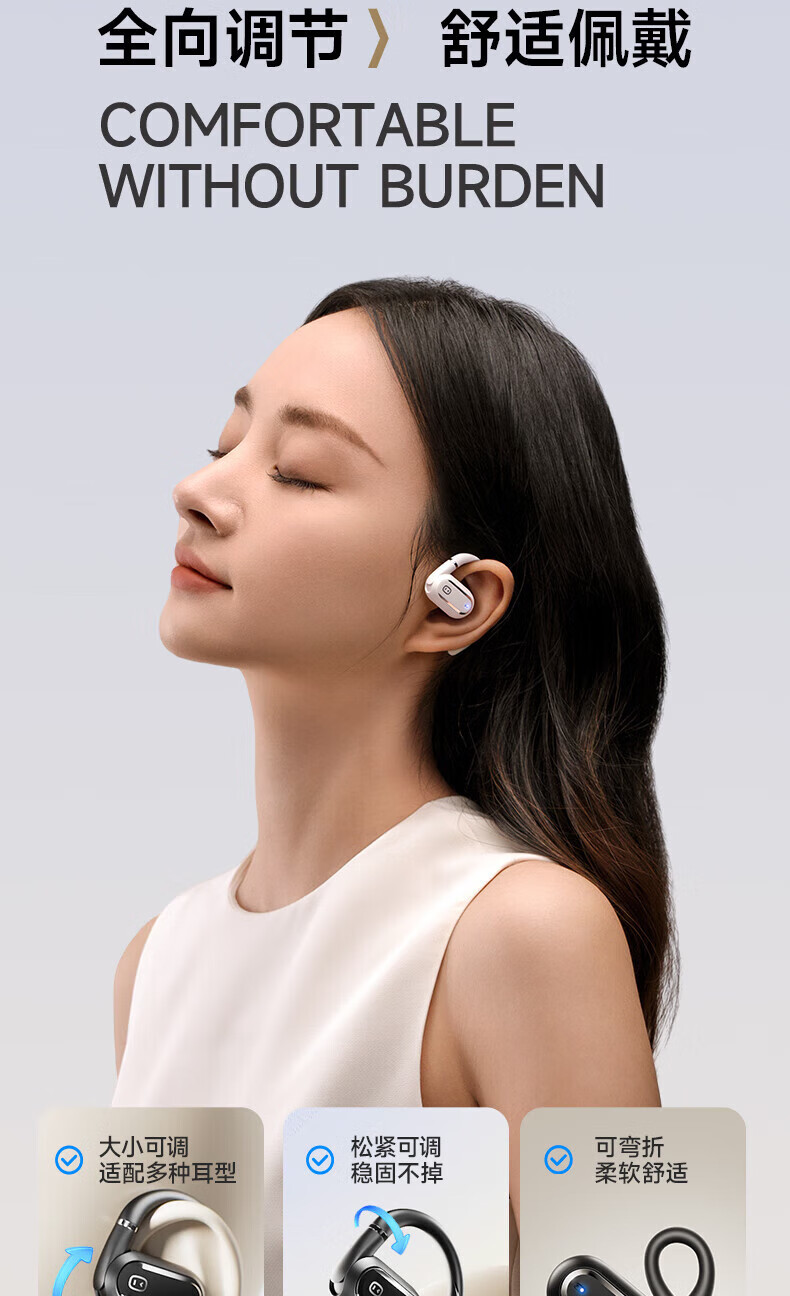 ① 量身定制:以匠心獨運的可調(diào)耳掛設(shè)計為核心亮點,能夠自由設(shè)定角度,專為追求佩戴 體驗的用戶打造。無論您的耳型如何獨特 ,只需輕輕一調(diào),即可享受如量身定制般的貼合感,無論是長時間佩戴還是劇烈運動,都能確保穩(wěn)固不滑落。
