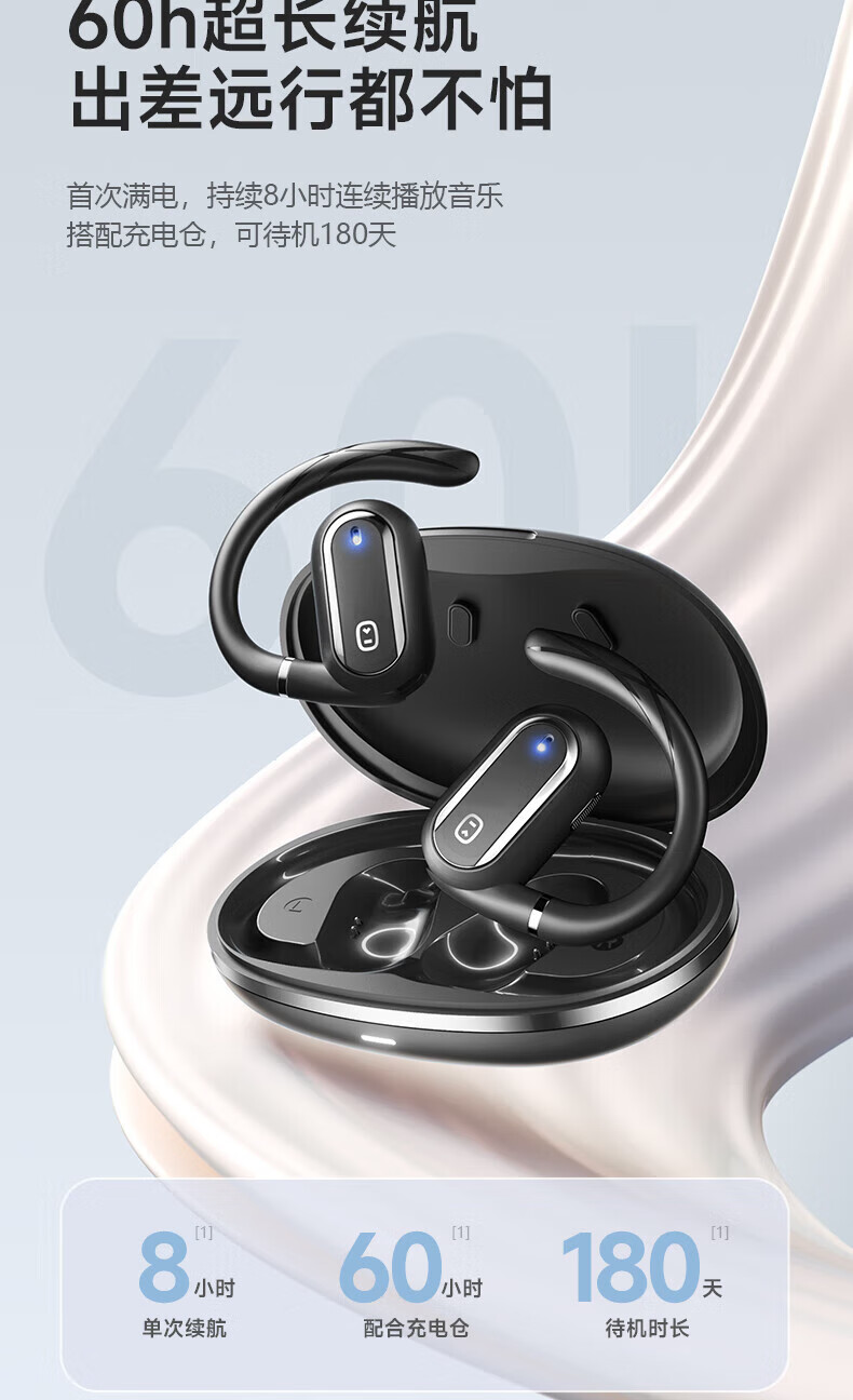 ⑤ 超長續(xù)航能力:單次使用可長8小時,配合充電盒使用更可實現(xiàn)60小時的超長續(xù)航。滿足長 時間戶外運動或健身鍛煉的需求。