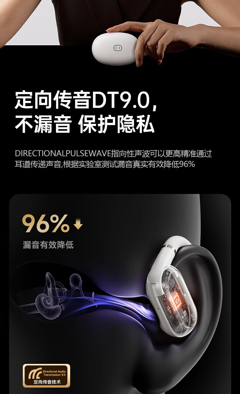 ④ 開放式定向音場科技:采用創(chuàng)新的開放式定向音場科技 ,令聲波入耳 ,定向傳音技術(shù)9.0,有效降低96%漏音,搭載四麥AI通話降噪技術(shù),即使在嘈雜環(huán)境中也能保護隱私 ,無需擔心 聲音外泄。