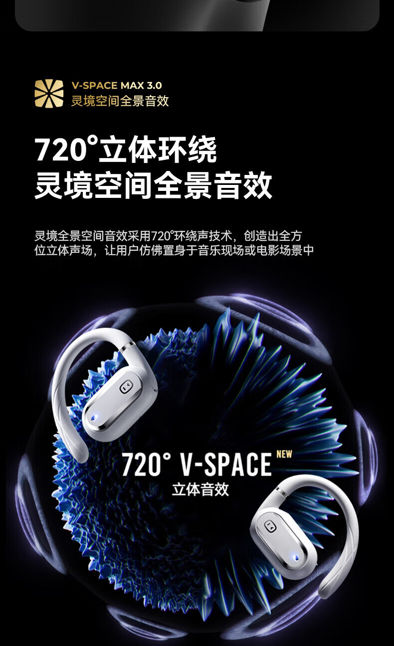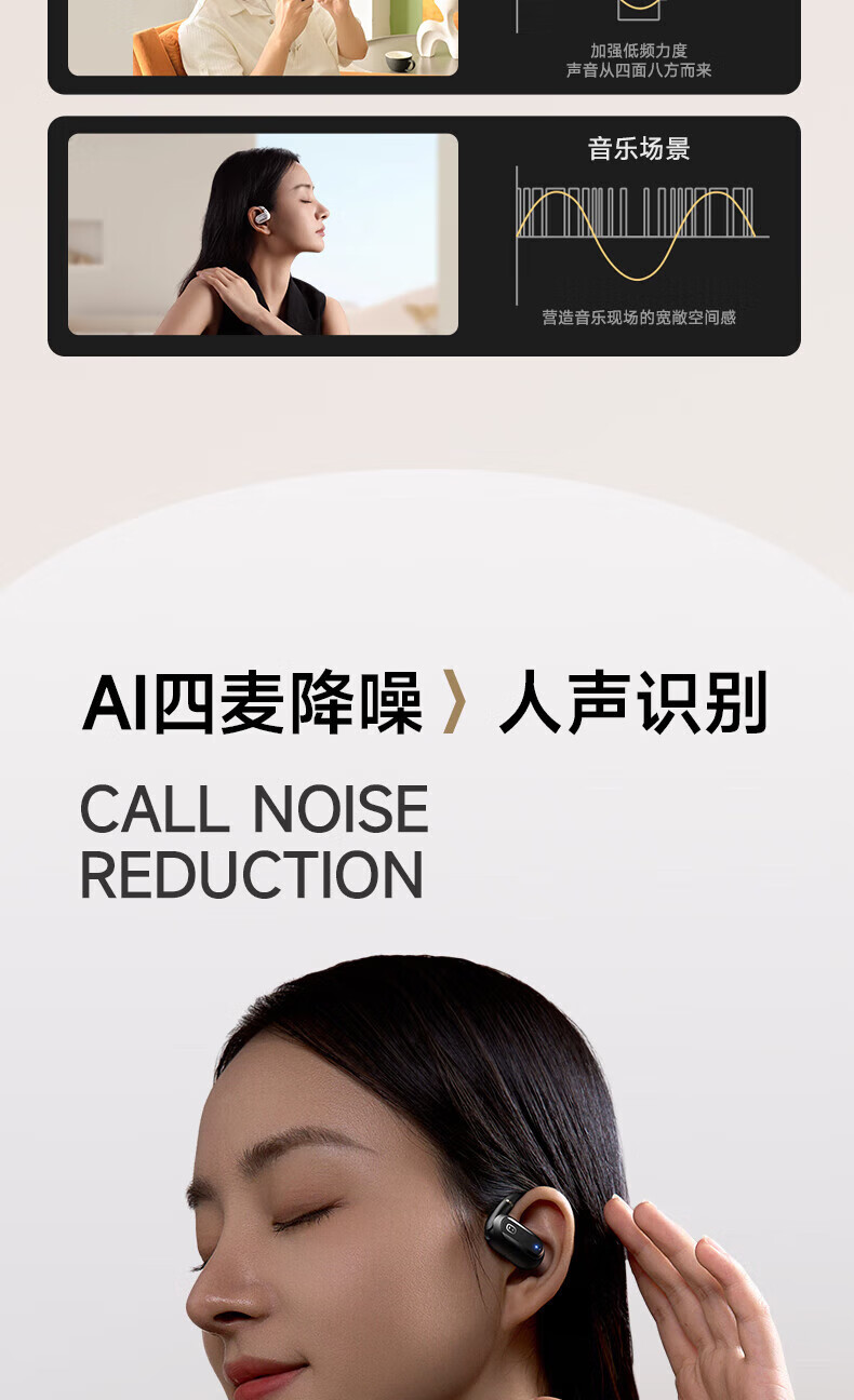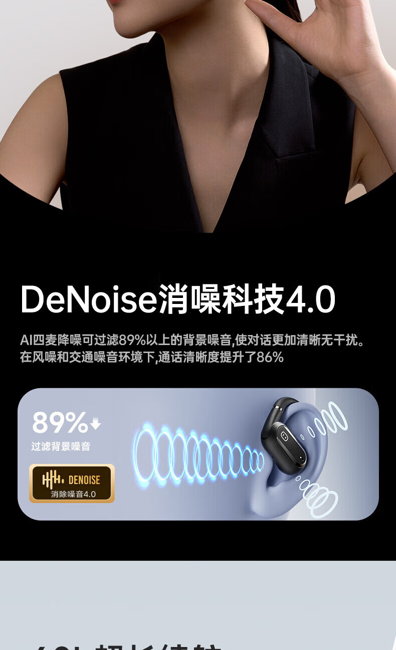 ② 環(huán)境感知與安全防護: 區(qū)別傳統(tǒng)入耳式 ,開放式設(shè)計 ,聽音樂時能清晰感知環(huán)境音,戶外運動更安全。DEN0ISE消除噪音4.0,可過濾89%背景噪音。