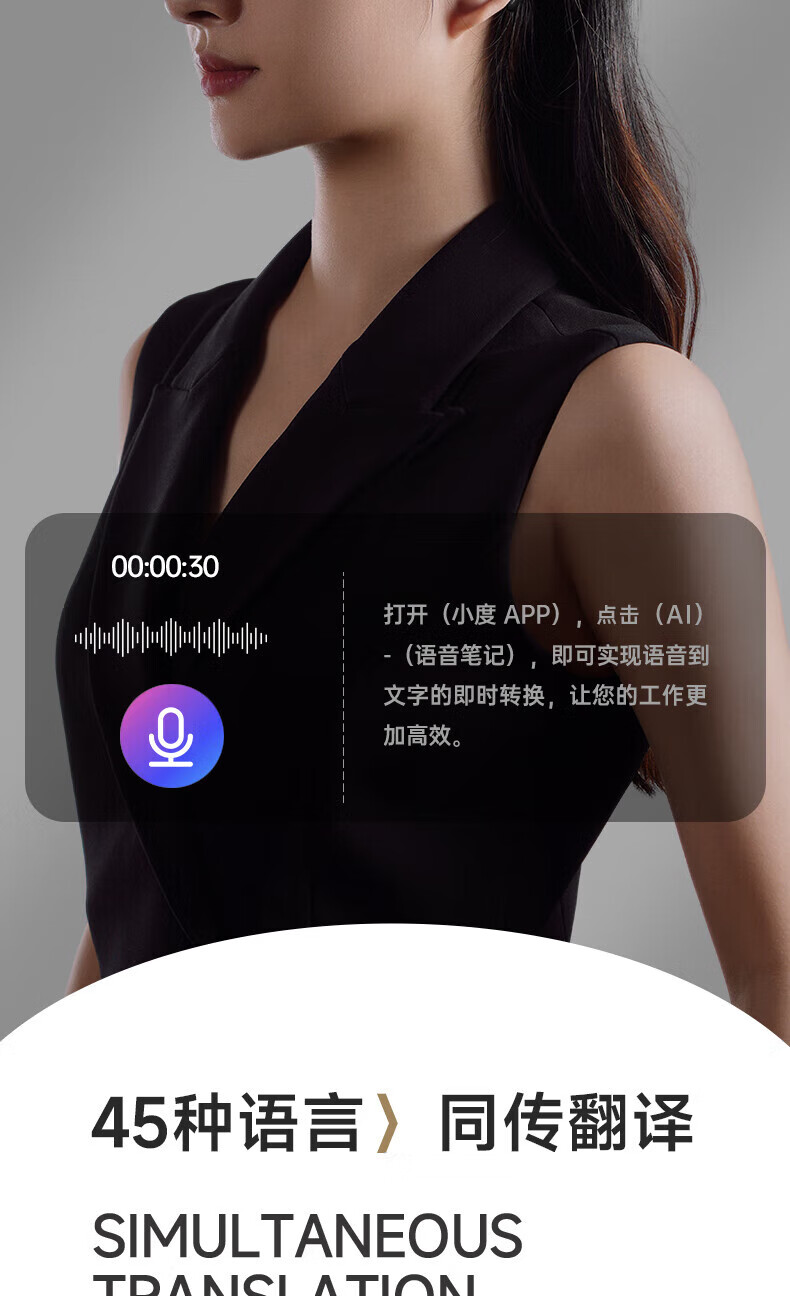 ⑥ 智能AI超能力:集成“文心大模型”“語音筆記”“同聲傳譯”等AI功能,滿足你商務交流、觀看英文原版視頻、出國旅游等多種需求。支持45種語言同聲互譯 ,滿足您的商務需求。