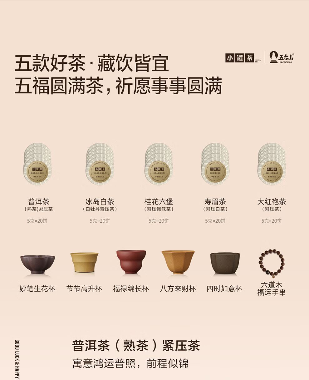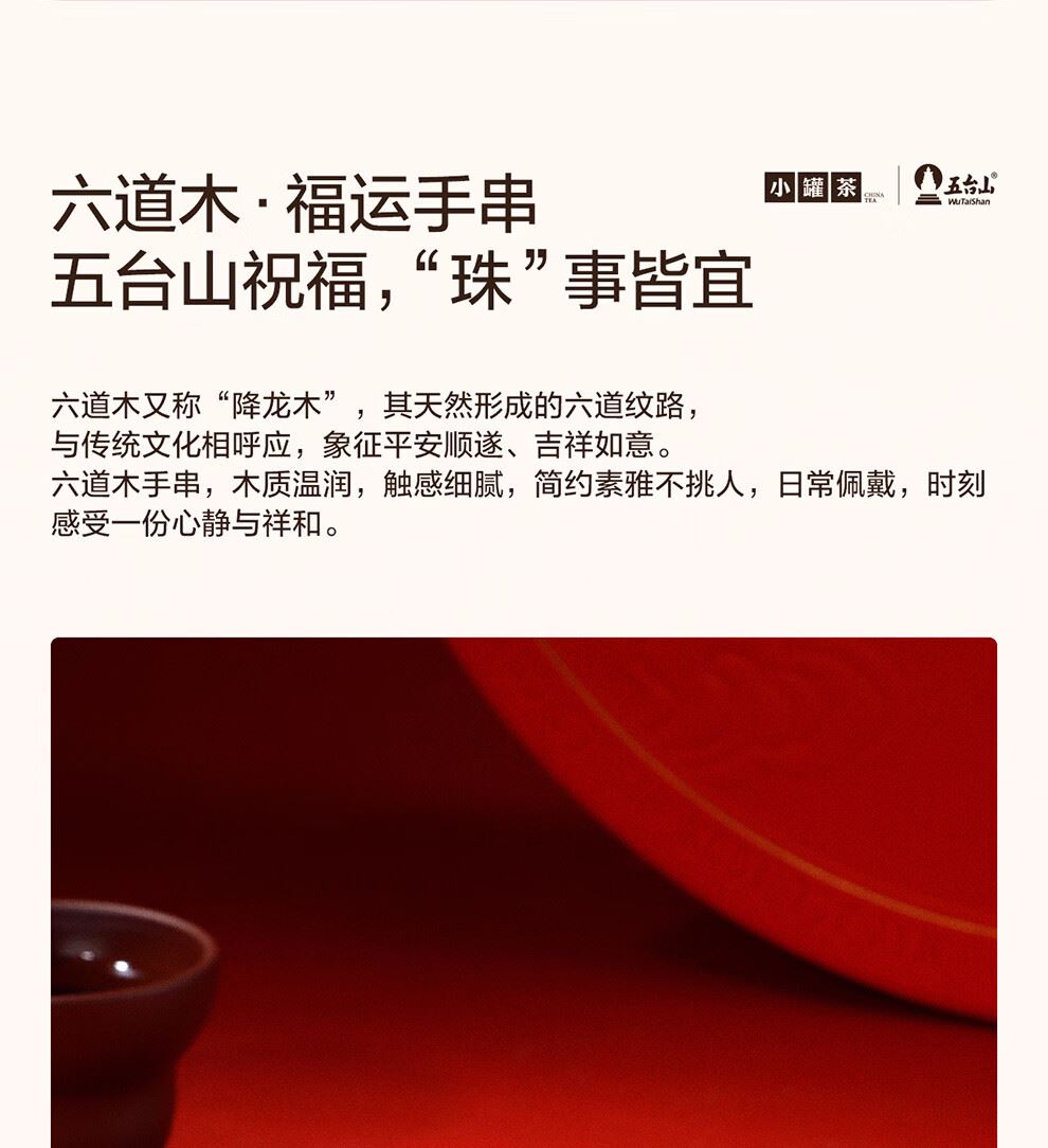 五福齊聚,事事圓滿;承接五臺(tái)山福運(yùn):禮盒融匯 “ 茶 、 器 、 手串 ” :五福圓滿茶 ,寓意事事圓滿 ;五福吉祥杯 ,象征承接五方福氣 ;六道木·福運(yùn)手串 ,讓祥瑞與鴻運(yùn)隨身相伴。一套禮盒 , 全方未承接五臺(tái)山的祝福。